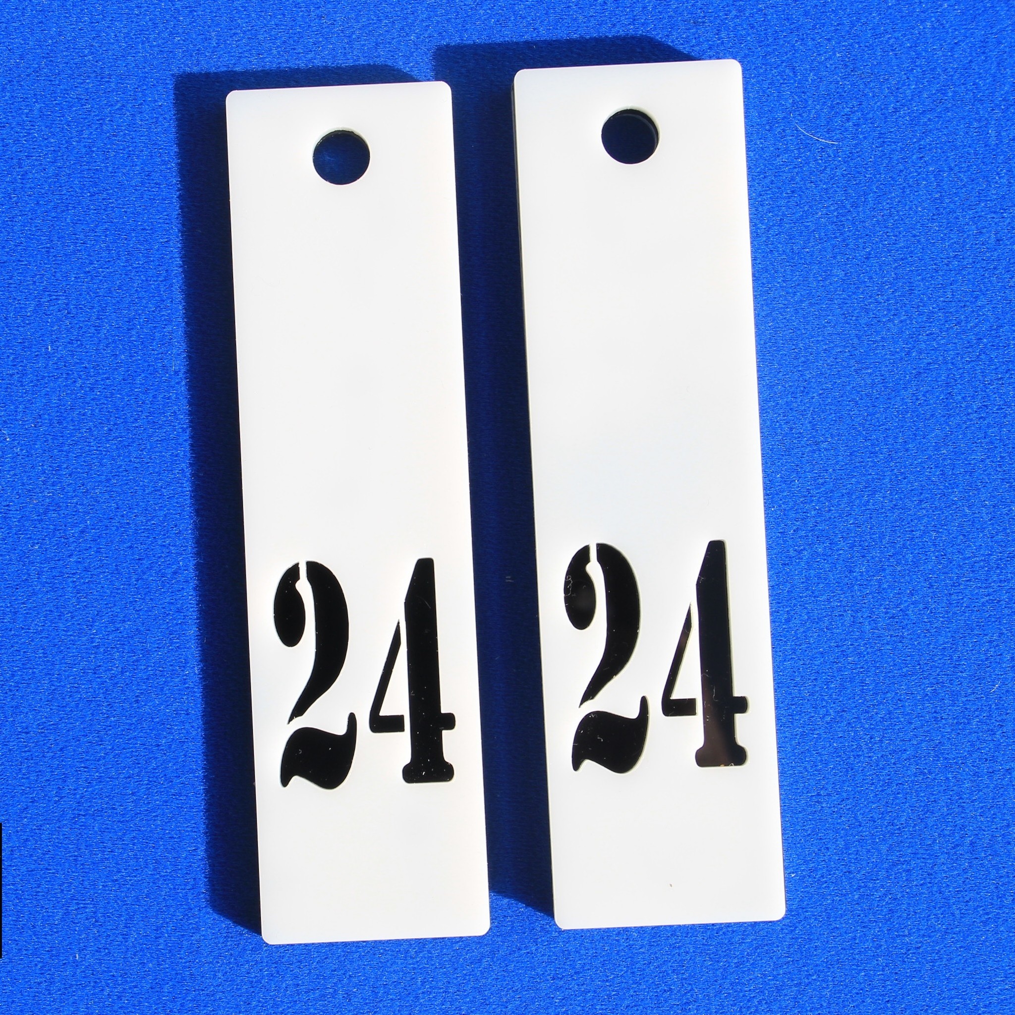 Sleutelhangers ABBEY, BIG ABBEY, NEW ABBEY en MIGHTY ABBEY in wit opaal plexiglas voorzien van een contrasterende plexiglas middenlaag en/of onderlaag. Sleutelhanger heeft dus 2 of 3 lagen plexiglas.