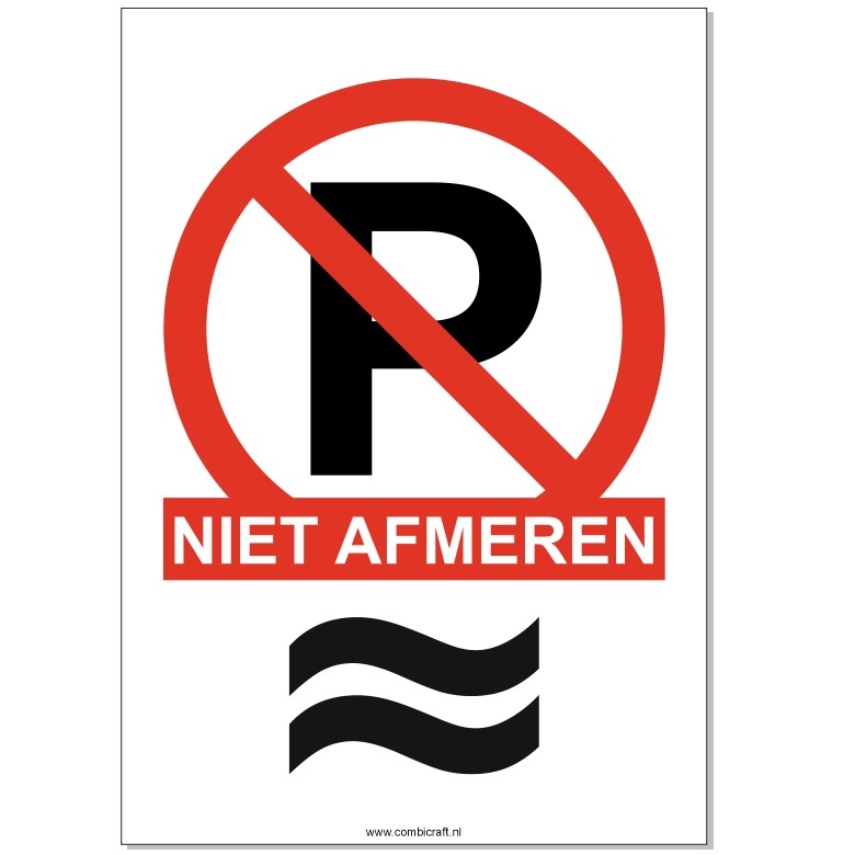 Een full Colour gedrukt aluminium CombiPaneel om aan te geven dat boten, schepen en andere vaartuigen hier niet aan mogen leggen. Het bord heeft het P-Symbool in een rode cirkel met een streep erdoor met als extra toevoeging: NIET AFMEREN.