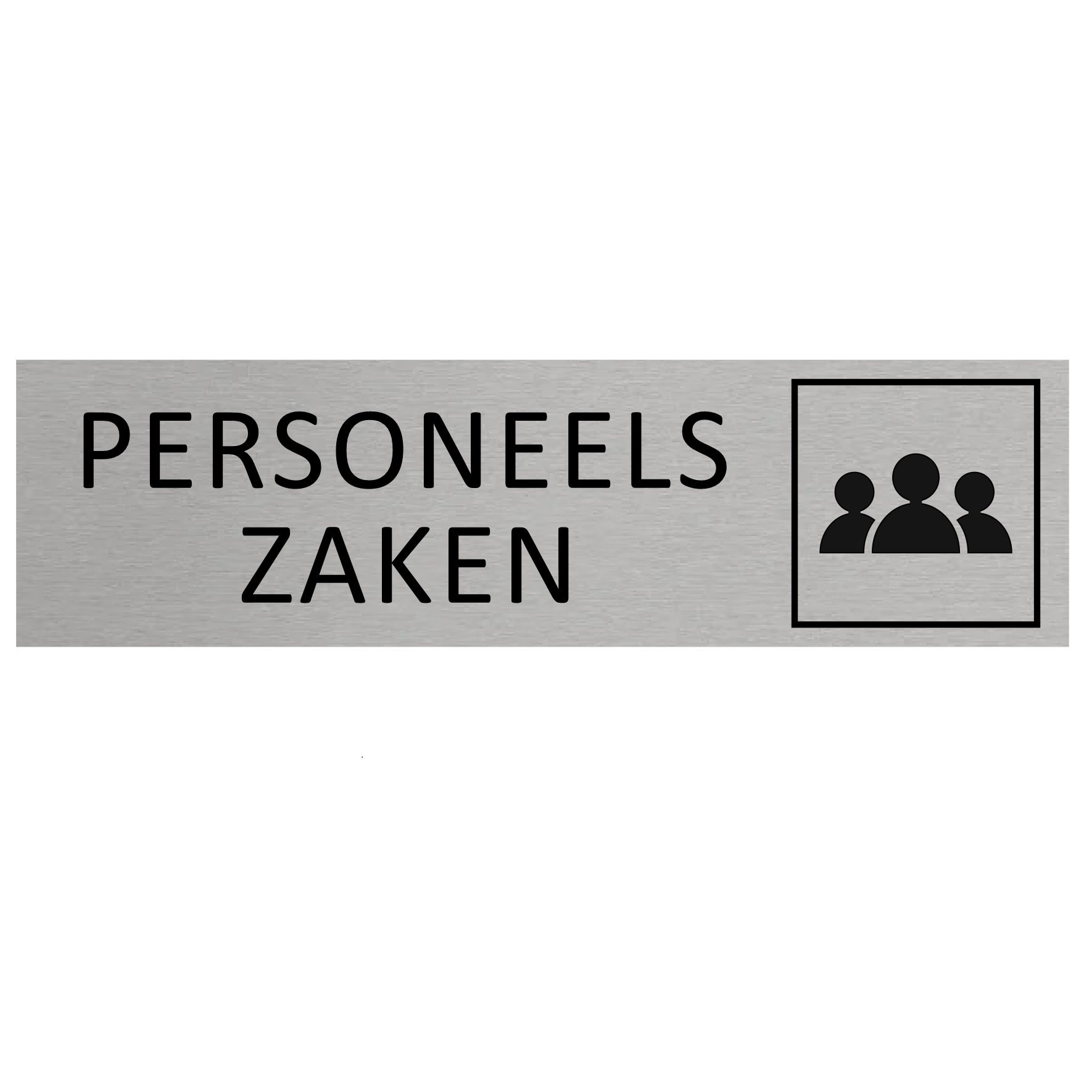 Deurbordje met de tekst Personeelszaken, gemaakt van zilverkleurig aluminium. Het bordje heeft afmetingen van 165 x 45 mm. Voorzien van dubbelzijdige tape voor makkelijke bevestiging. Geschikt voor binnen en buiten. Per 1 stuk.