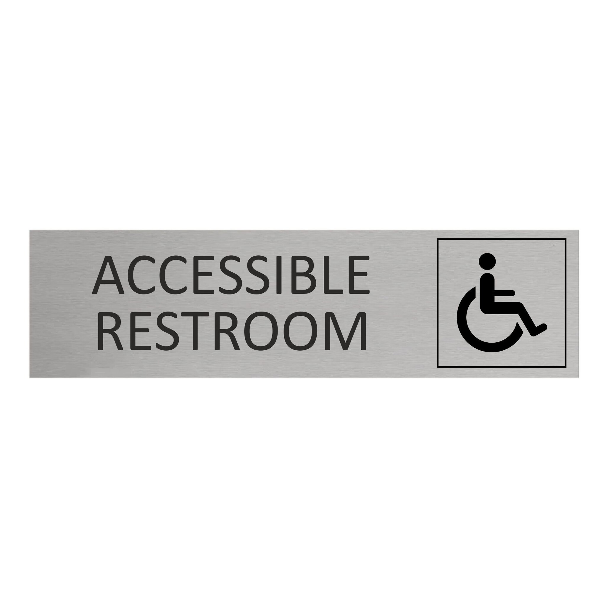 Deurbordje met de tekst 'Accessible restroom', gemaakt van zilverkleurig aluminium, Het bordje heeft afmetingen van 165 x 45 mm. Voorzien van dubbelzijdige tape voor makkelijke bevestiging. Geschikt voor binnen en buiten. Per 1 stuk.