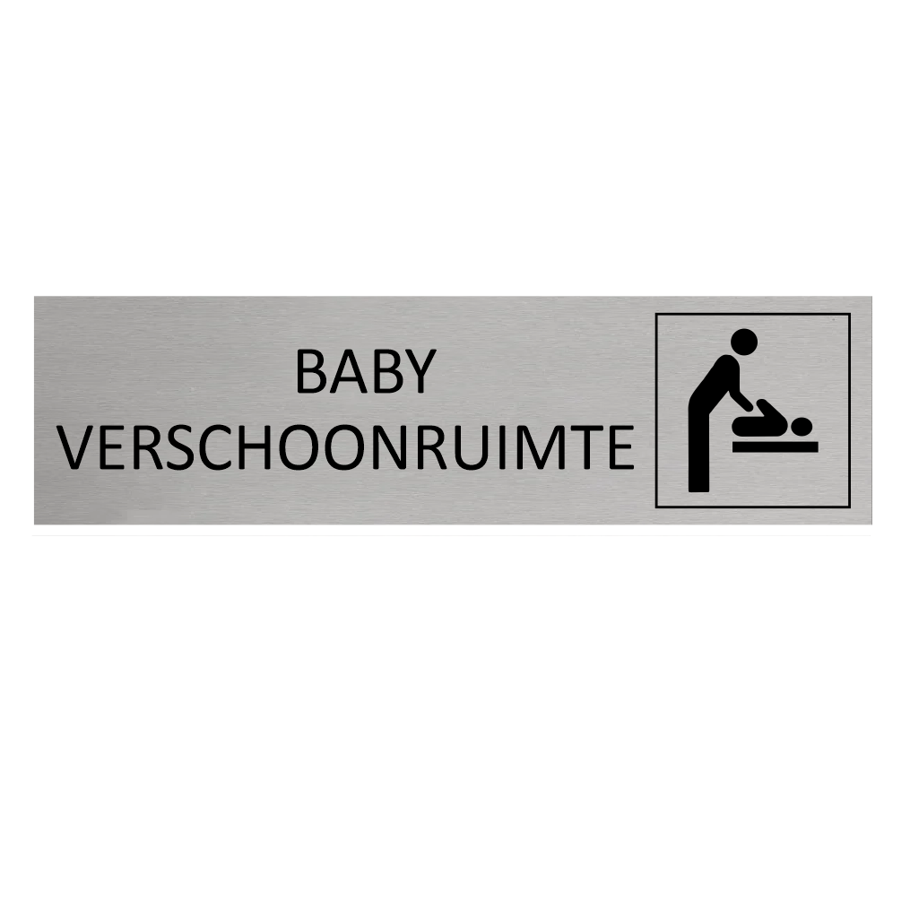 Deurbordje met de tekst Baby verschoonruimte, gemaakt van zilverkleurig aluminium. Het bordje heeft afmetingen van 165 x 45 mm. Voorzien van dubbelzijdige tape voor makkelijke bevestiging. Geschikt voor binnen en buiten. Per 1 stuk.