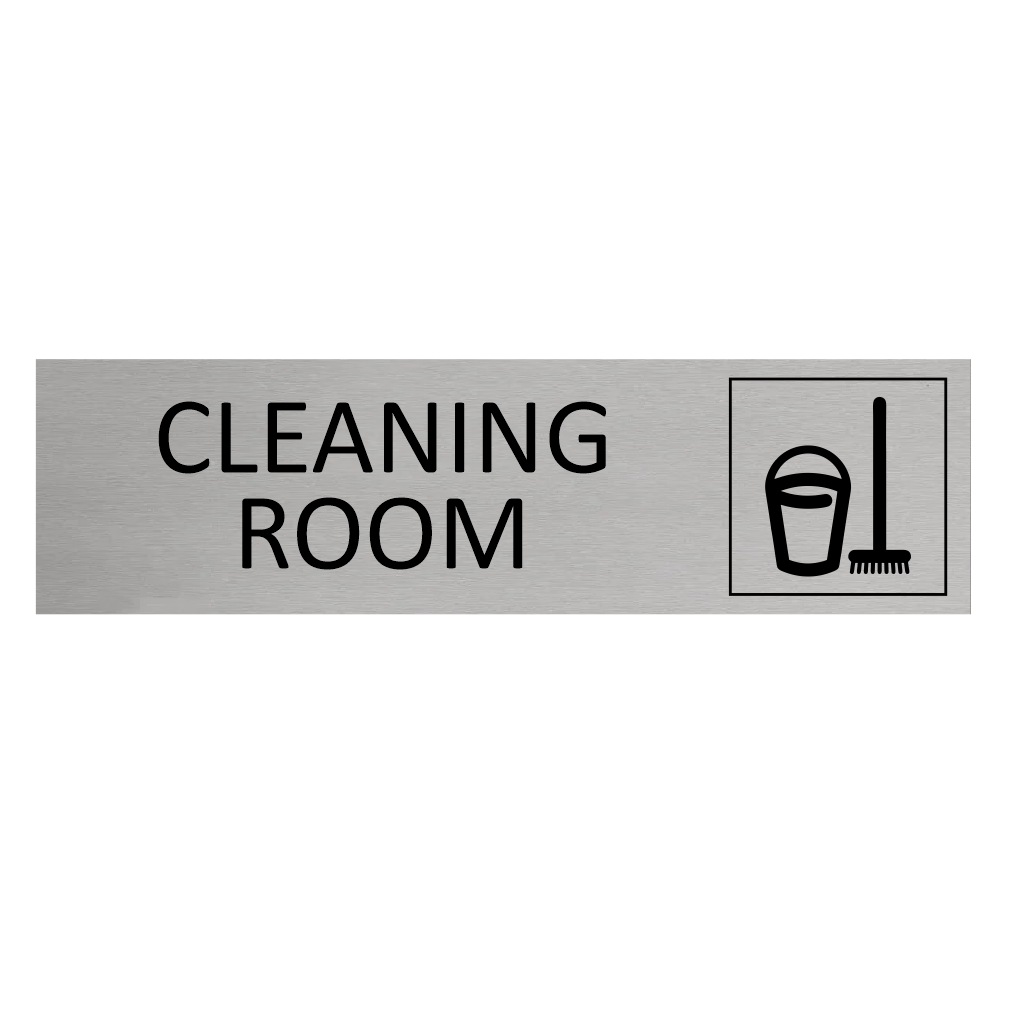 Deurbordje met de tekst 'Cleaning room', gemaakt van zilverkleurig aluminium, Het bordje heeft afmetingen van 165 x 45 mm. Voorzien van dubbelzijdige tape voor makkelijke bevestiging. Geschikt voor binnen en buiten. Per 1 stuk.