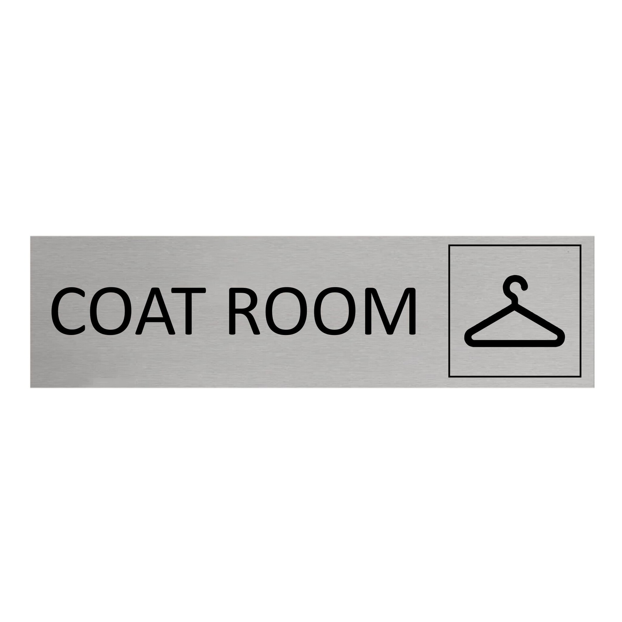 Deurbordje met de tekst 'Coat room', gemaakt van zilverkleurig aluminium, Het bordje heeft afmetingen van 165 x 45 mm. Voorzien van dubbelzijdige tape voor makkelijke bevestiging. Geschikt voor binnen en buiten. Per 1 stuk.
