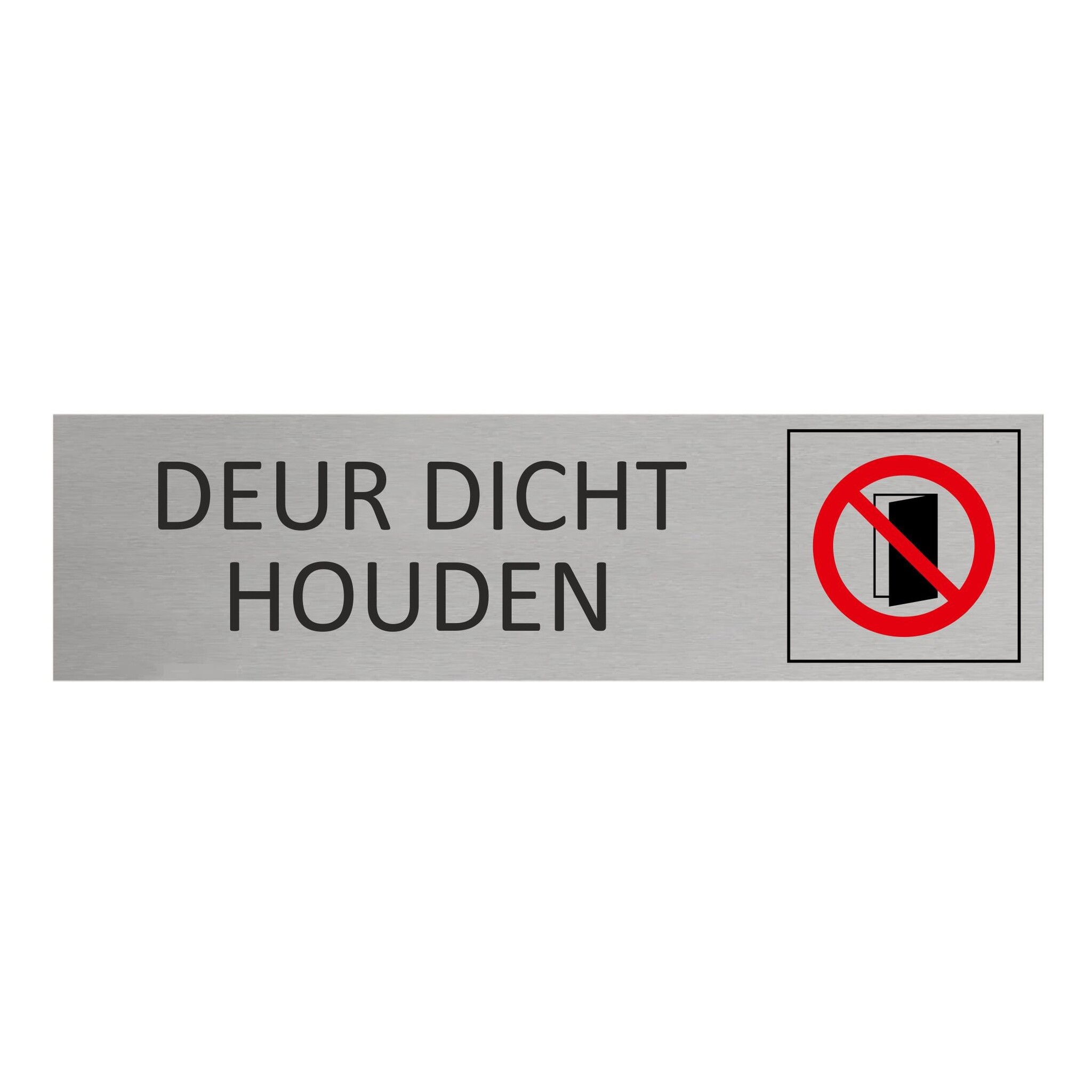 Deurbordje met de tekst 'Deur dicht houden', gemaakt van zilverkleurig aluminium. Het bordje heeft afmetingen van 165 x 45 mm en een dikte van 0,5 mm. Aan de achterzijde zit 3M-tape, voor makkelijke bevestiging. Geschikt voor binnen en buiten. Per 1 stuk.