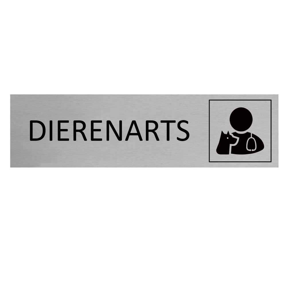 Deurbordje met de tekst Dierenarts, gemaakt van zilverkleurig aluminium. Het bordje heeft afmetingen van 165 x 45 mm. Voorzien van dubbelzijdige tape voor makkelijke bevestiging. Geschikt voor binnen en buiten. Per 1 stuk.