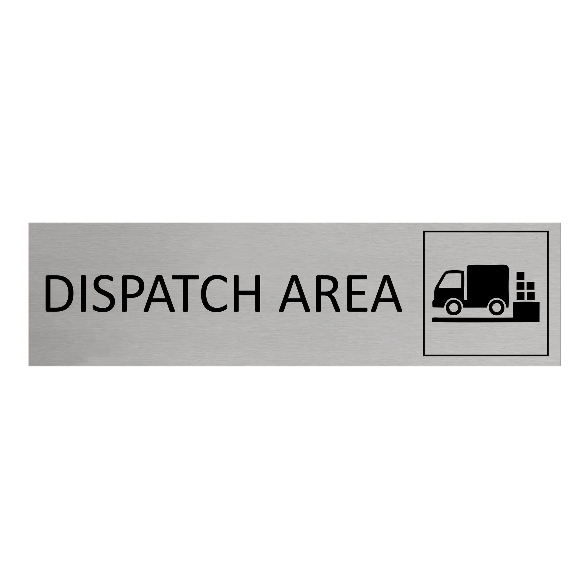 Deurbordje met de tekst 'Dispatch area', gemaakt van zilverkleurig aluminium, Het bordje heeft afmetingen van 165 x 45 mm. Voorzien van dubbelzijdige tape voor makkelijke bevestiging. Geschikt voor binnen en buiten. Per 1 stuk.
