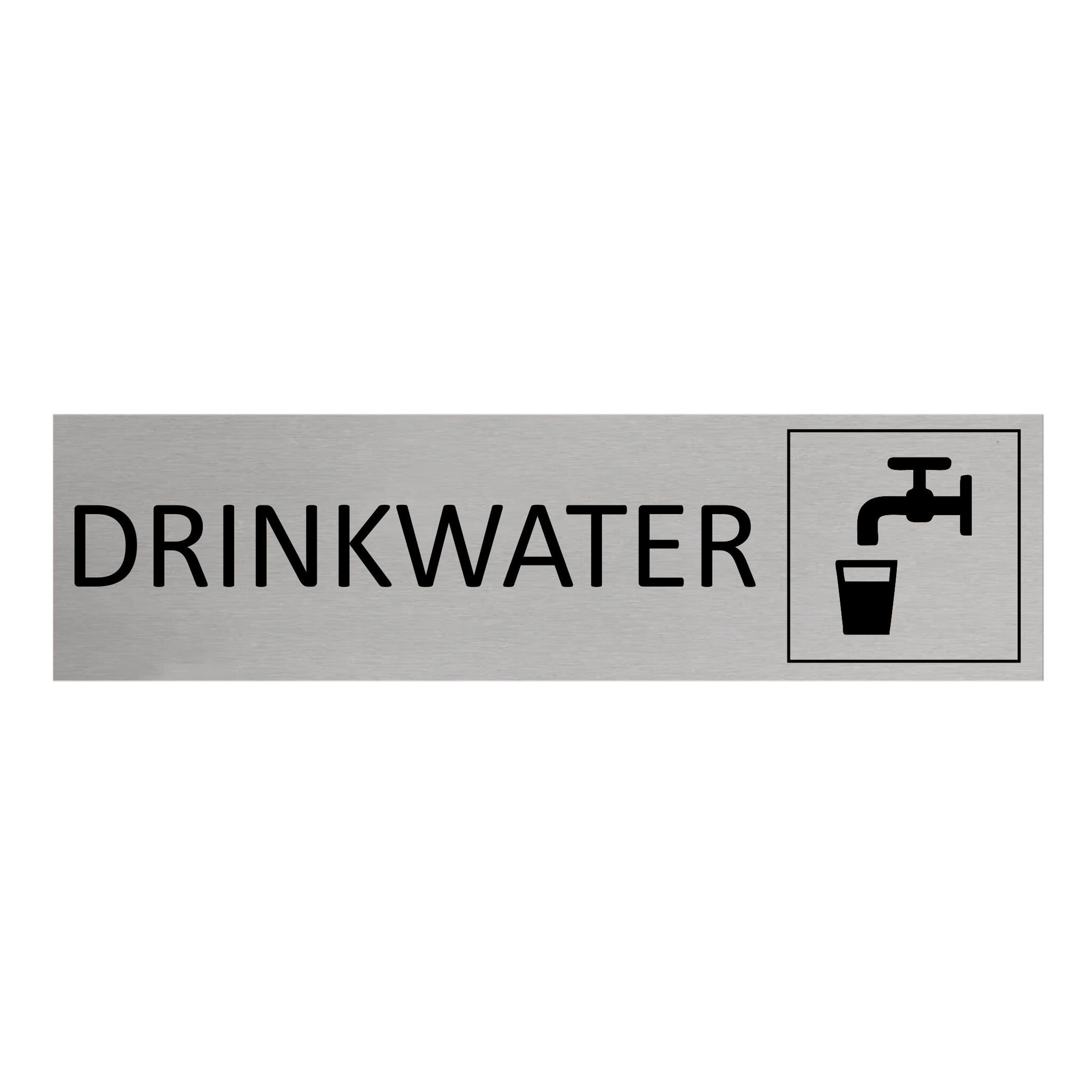 Zilverkleurig deurbordje met de tekst drinkwater. Het deurbordje heeft afmetingen van 165 x 45 mm en een dikte van 0,5 mm. Aan de achterzijde zit 3M-tape, voor snelle bevestiging. Geschikt voor binnen en buiten. Per 1 stuk.