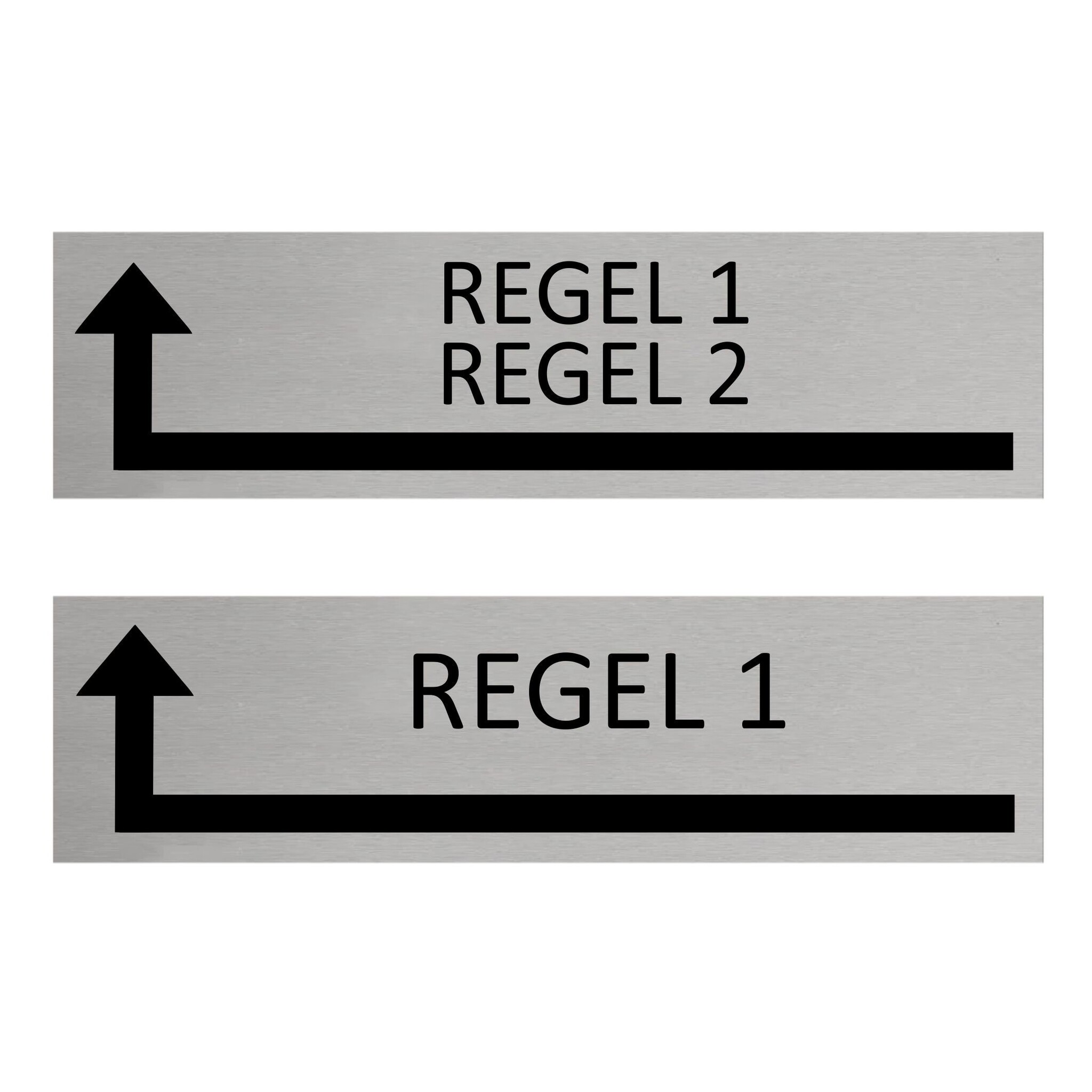 Zilverkleurig deurbordje met een pijl links om de hoek met jouw eigen tekst. Het deurbordje heeft afmetingen van 165 x 45 mm en een dikte van 0,5 mm. Aan de achterzijde zit 3M-tape, voor snelle bevestiging. Geschikt voor binnen en buiten. Per 1 stuk.