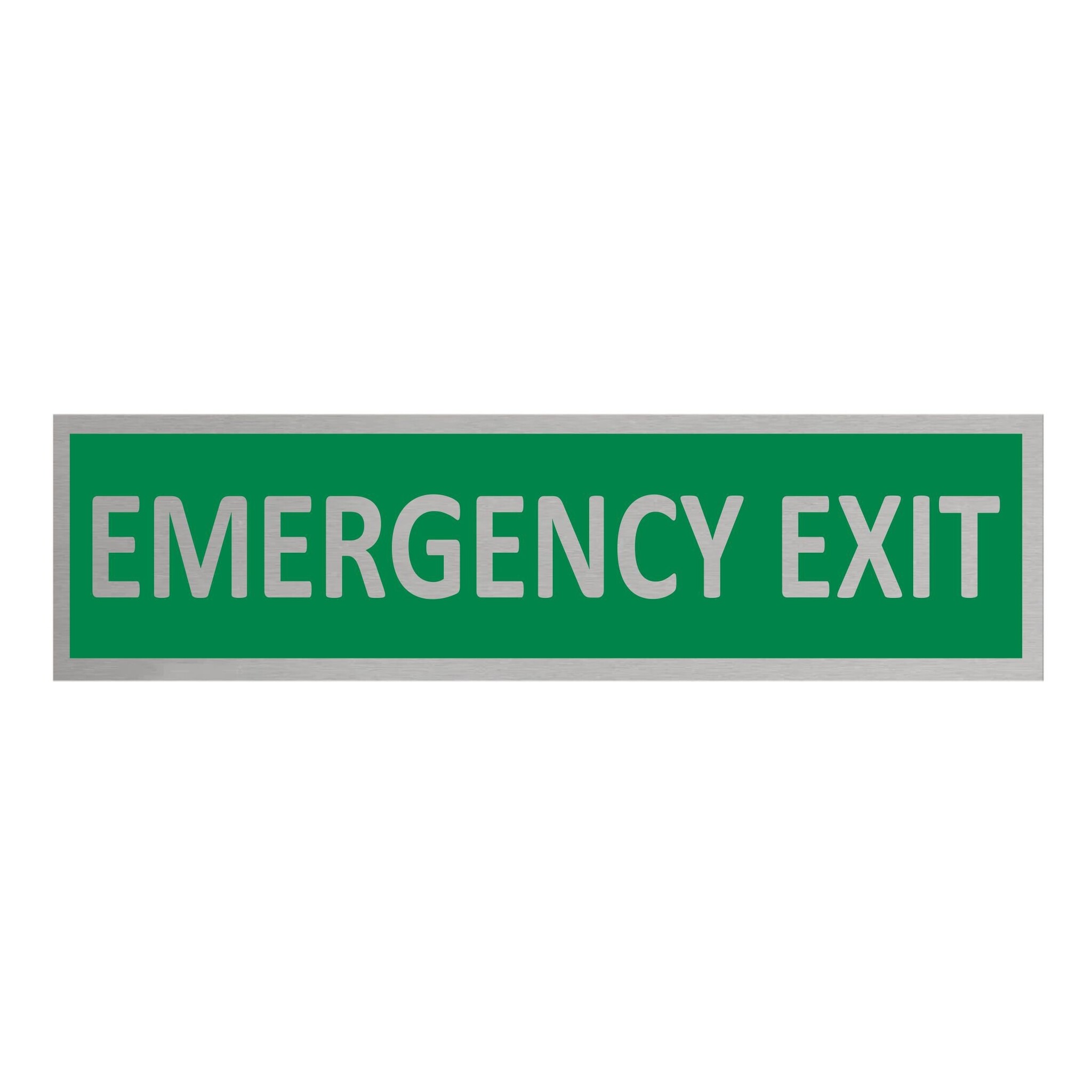 Deurbordje met de tekst 'Emergency exit', gemaakt van zilverkleurig aluminium, Het bordje heeft afmetingen van 165 x 45 mm. Voorzien van dubbelzijdige tape voor makkelijke bevestiging. Geschikt voor binnen en buiten. Per 1 stuk.