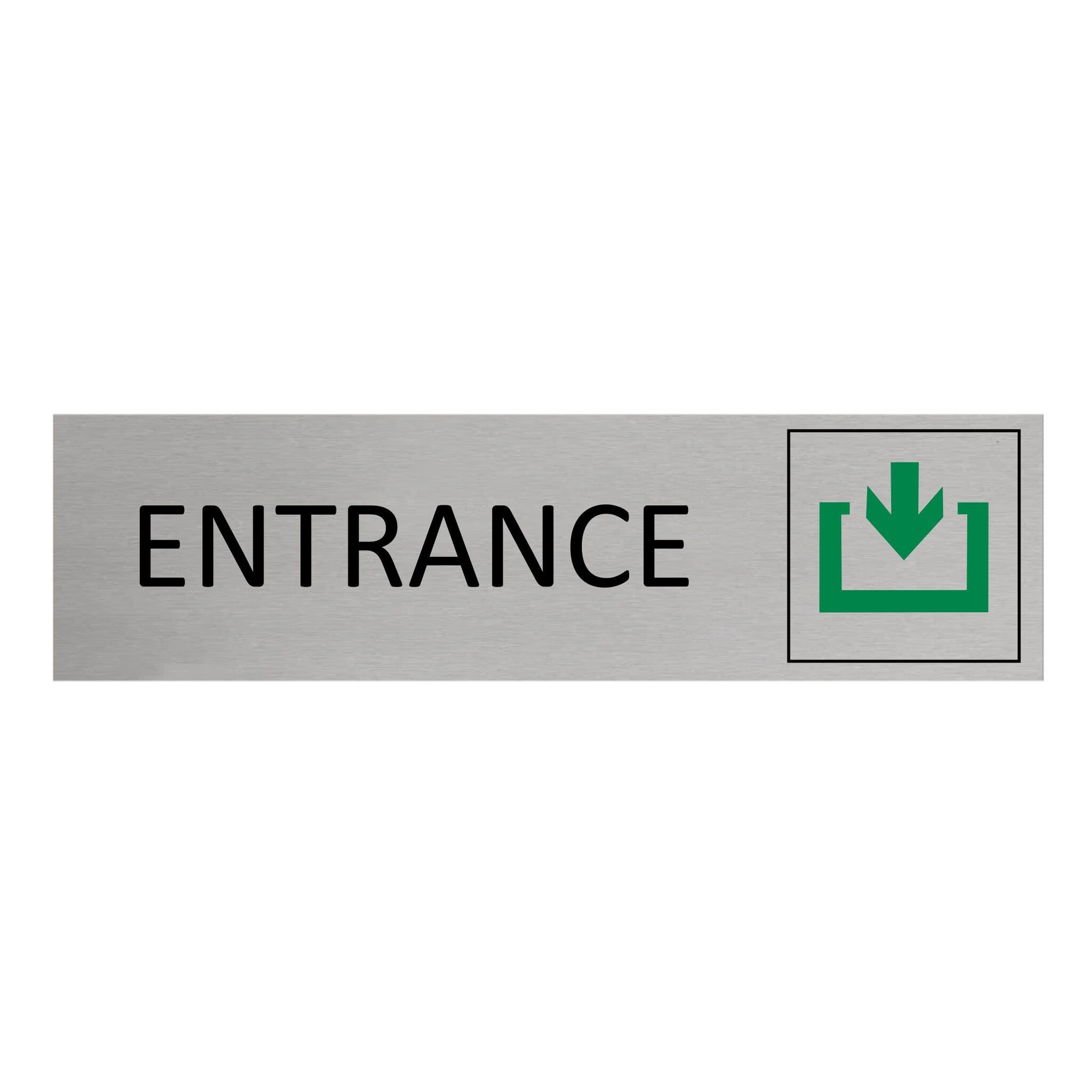 Deurbordje met de tekst 'Entrance', gemaakt van zilverkleurig aluminium, Het bordje heeft afmetingen van 165 x 45 mm. Voorzien van dubbelzijdige tape voor makkelijke bevestiging. Geschikt voor binnen en buiten. Per 1 stuk.