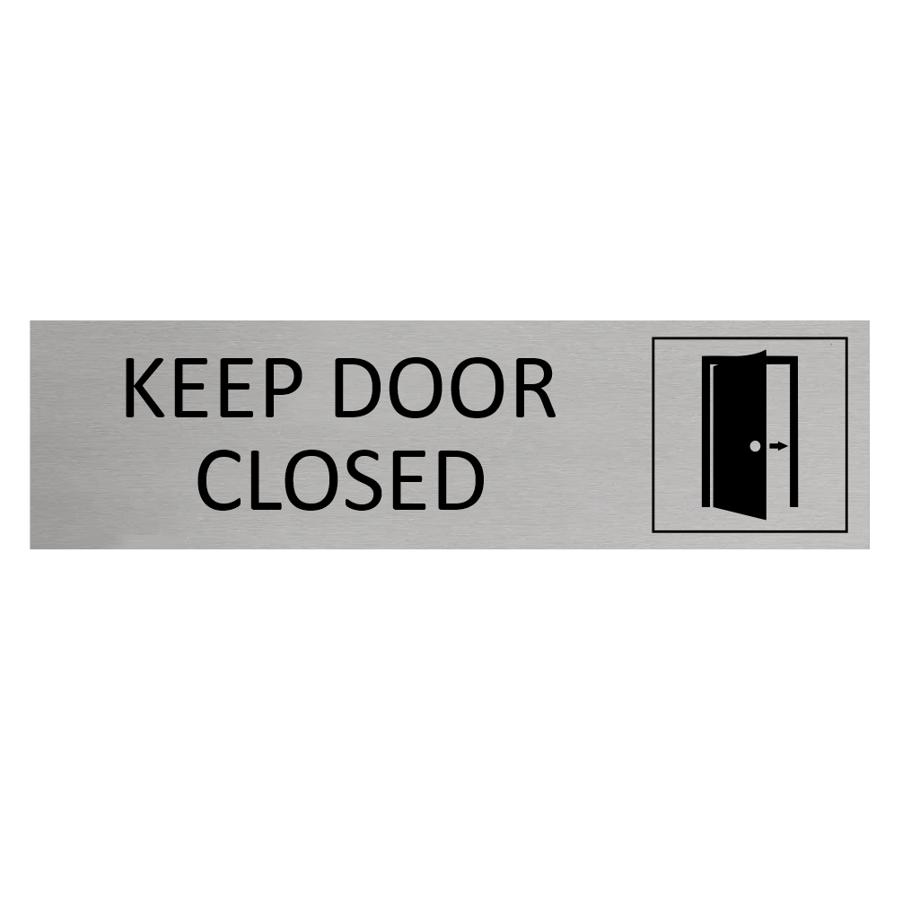 Deurbordje met de tekst 'Keep door closed', gemaakt van zilverkleurig aluminium, Het bordje heeft afmetingen van 165 x 45 mm. Voorzien van dubbelzijdige tape voor makkelijke bevestiging. Geschikt voor binnen en buiten. Per 1 stuk.
