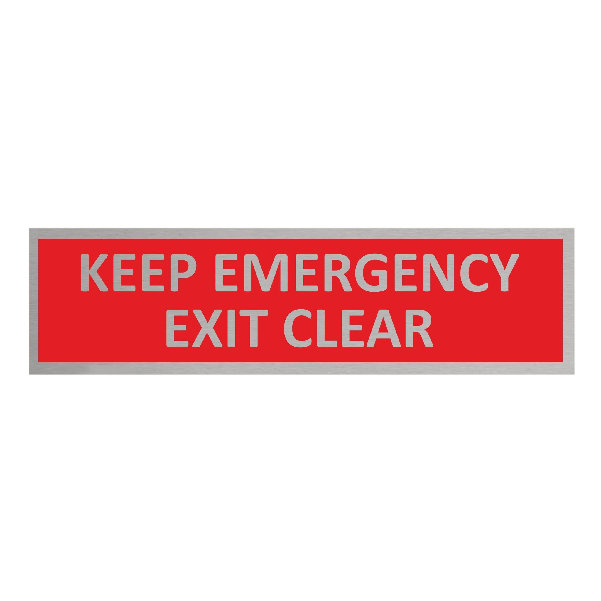 Deurbordje met de tekst 'Keep emergency exit clear', gemaakt van zilverkleurig aluminium, Het bordje heeft afmetingen van 165 x 45 mm. Voorzien van dubbelzijdige tape voor makkelijke bevestiging. Geschikt voor binnen en buiten. Per 1 stuk.