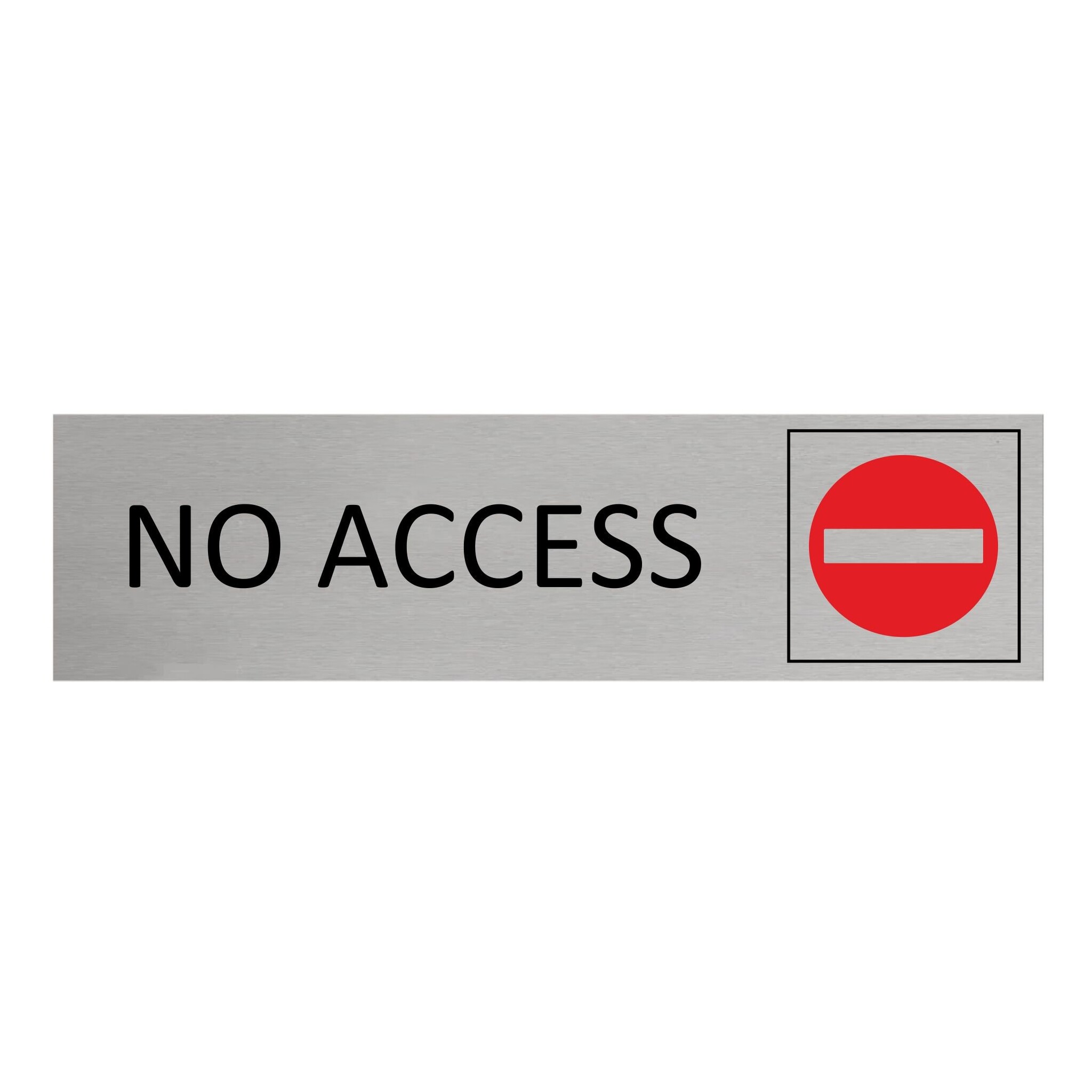 Deurbordje met de tekst 'No access', gemaakt van zilverkleurig aluminium, Het bordje heeft afmetingen van 165 x 45 mm. Voorzien van dubbelzijdige tape voor makkelijke bevestiging. Geschikt voor binnen en buiten. Per 1 stuk.