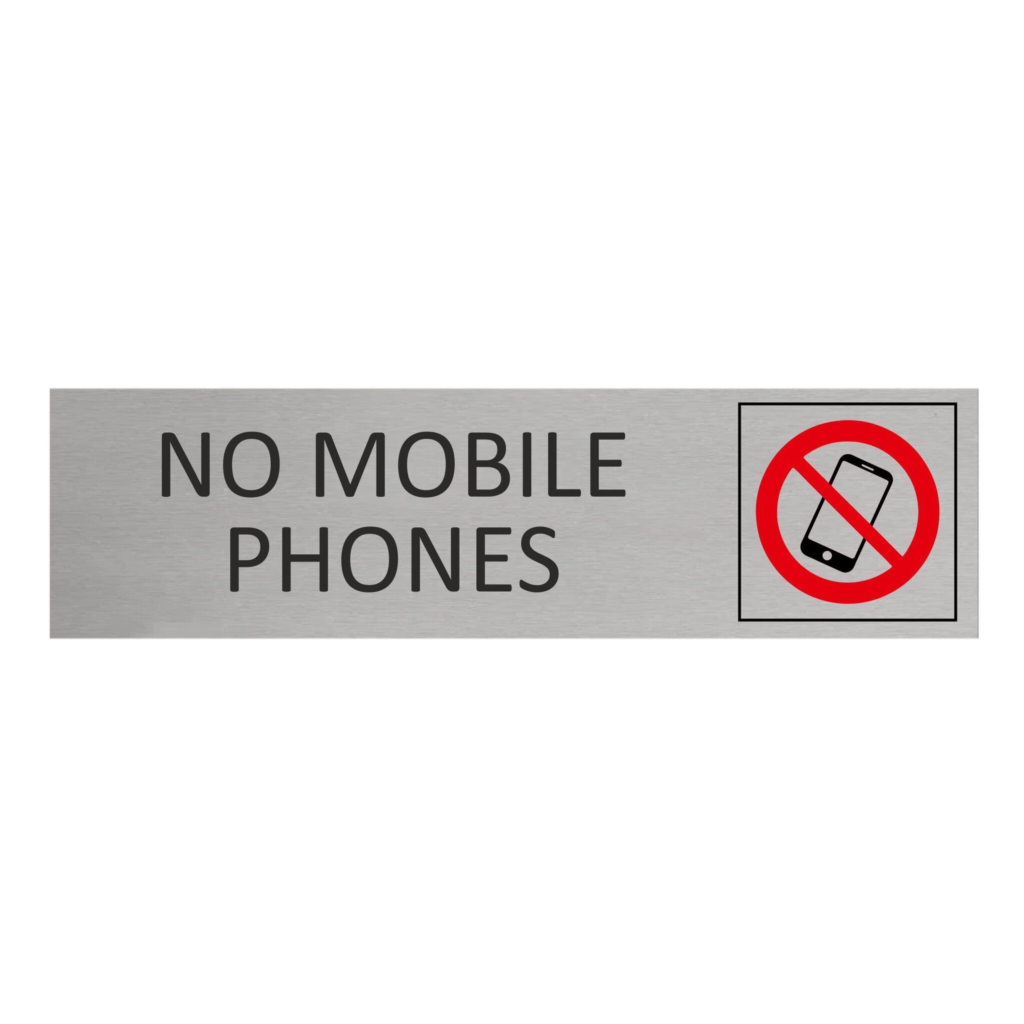 Deurbordje met de tekst 'No mobile phones', gemaakt van zilverkleurig aluminium, Het bordje heeft afmetingen van 165 x 45 mm. Voorzien van dubbelzijdige tape voor makkelijke bevestiging. Geschikt voor binnen en buiten. Per 1 stuk.