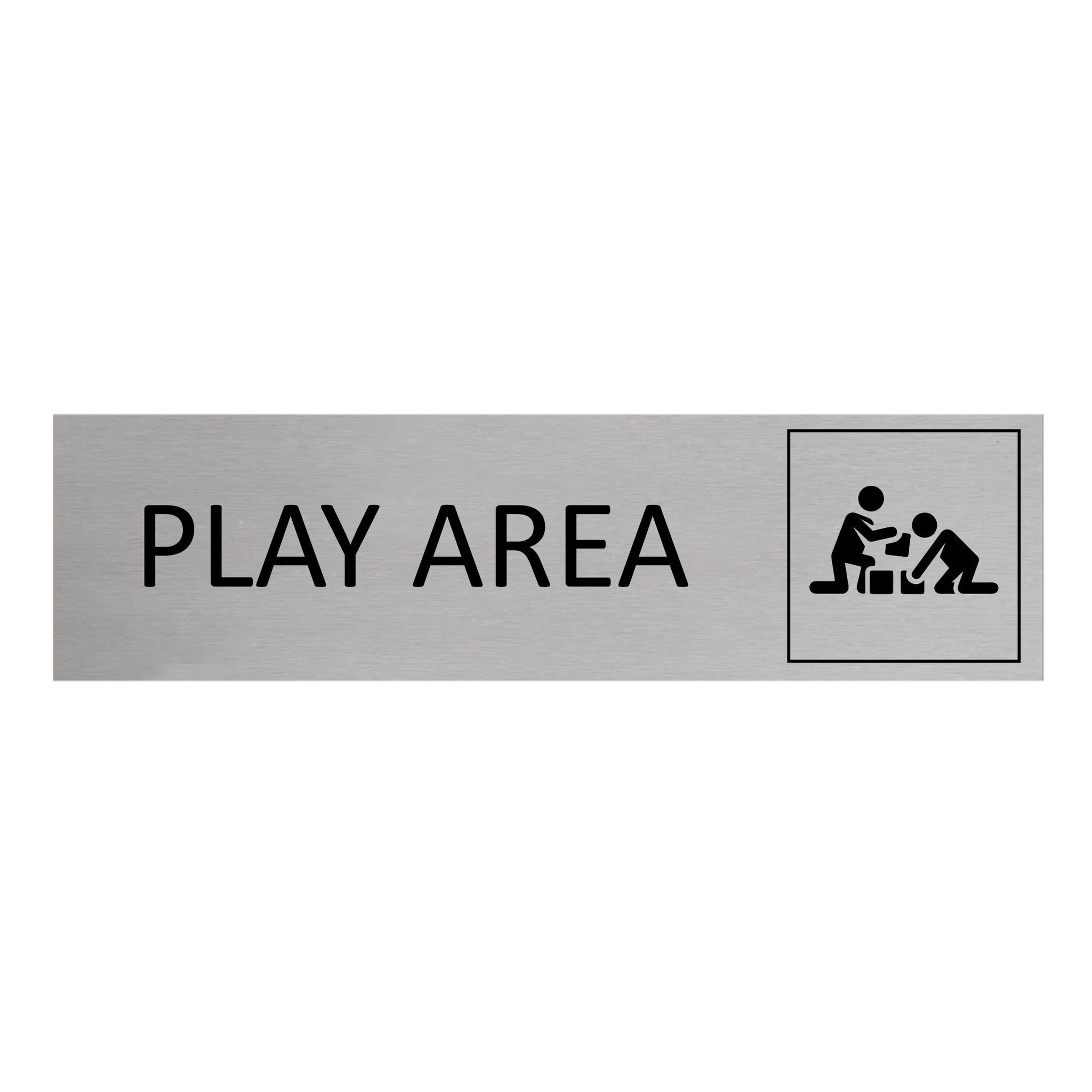 Deurbordje met de tekst 'Play area', gemaakt van zilverkleurig aluminium, Het bordje heeft afmetingen van 165 x 45 mm. Voorzien van dubbelzijdige tape voor makkelijke bevestiging. Geschikt voor binnen en buiten. Per 1 stuk.
