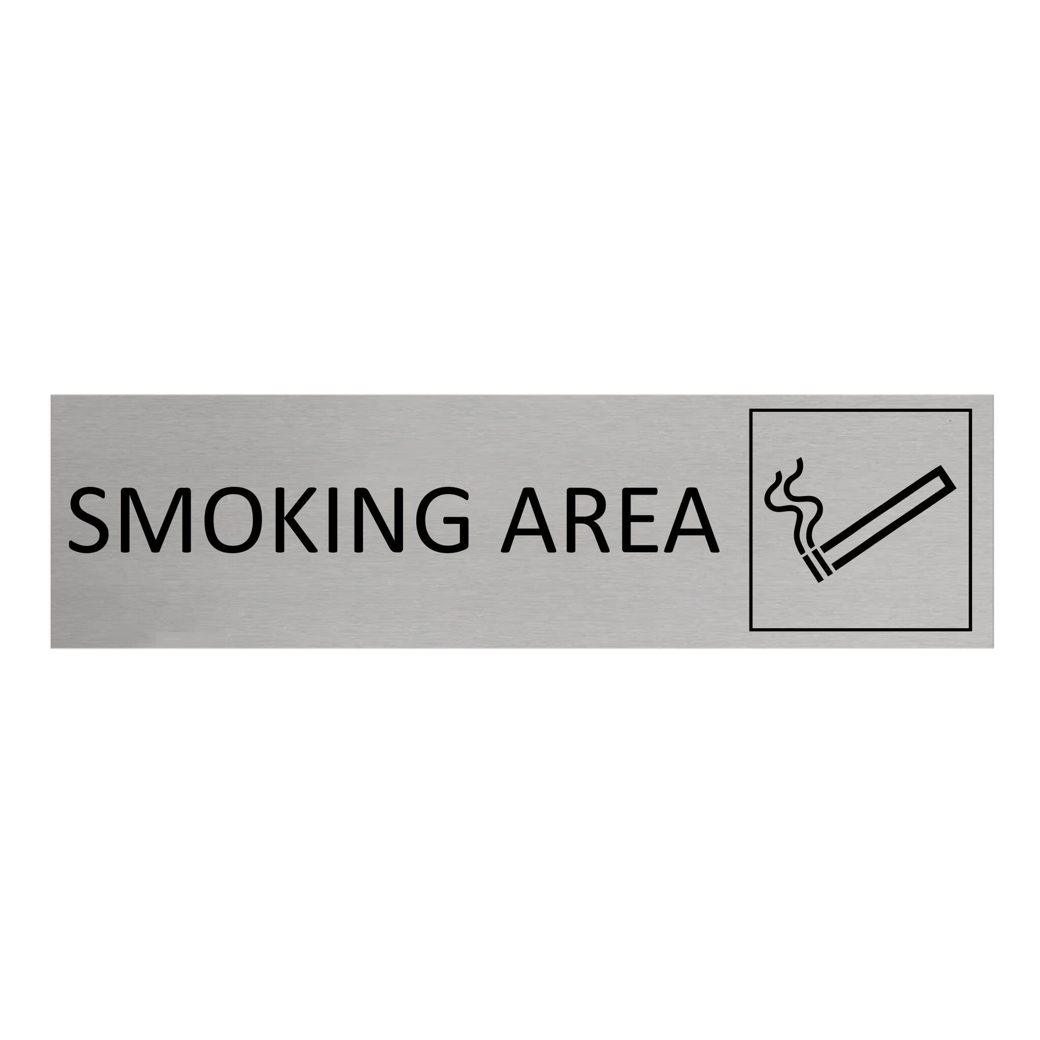 Deurbordje met de tekst 'Smoking area', gemaakt van zilverkleurig aluminium, Het bordje heeft afmetingen van 165 x 45 mm. Voorzien van dubbelzijdige tape voor makkelijke bevestiging. Geschikt voor binnen en buiten. Per 1 stuk.