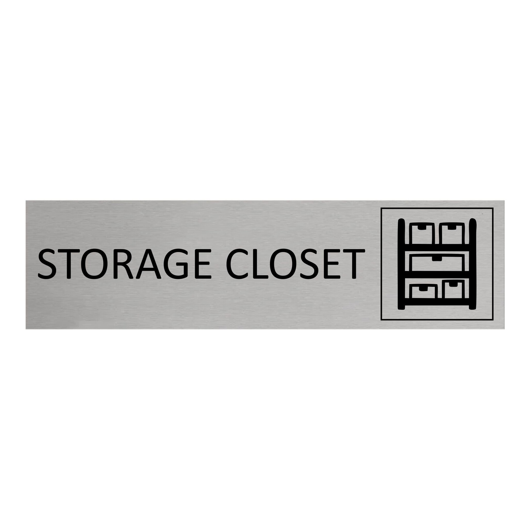 Deurbordje met de tekst 'Storage closet', gemaakt van zilverkleurig aluminium, Het bordje heeft afmetingen van 165 x 45 mm. Voorzien van dubbelzijdige tape voor makkelijke bevestiging. Geschikt voor binnen en buiten. Per 1 stuk.