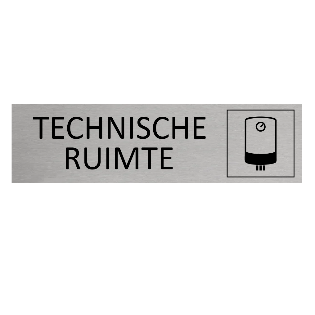 Deurbordje met de tekst Technische ruimte, gemaakt van zilverkleurig aluminium. Het bordje heeft afmetingen van 165 x 45 mm. Voorzien van dubbelzijdige tape voor makkelijke bevestiging. Geschikt voor binnen en buiten. Per 1 stuk.