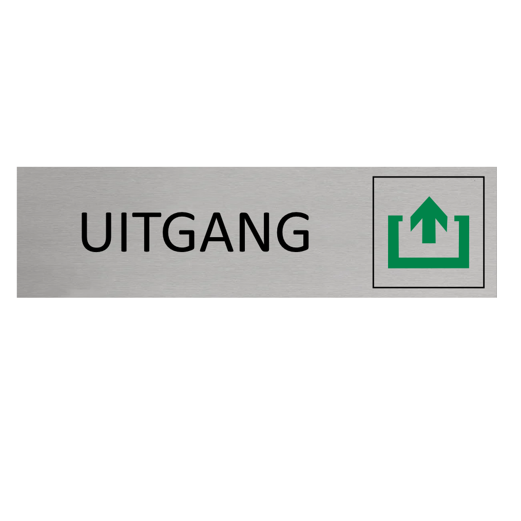 Deurbordje met de tekst Uitgang, gemaakt van zilverkleurig aluminium. Het bordje heeft afmetingen van 165 x 45 mm. Voorzien van dubbelzijdige tape voor makkelijke bevestiging. Geschikt voor binnen en buiten. Per 1 stuk.