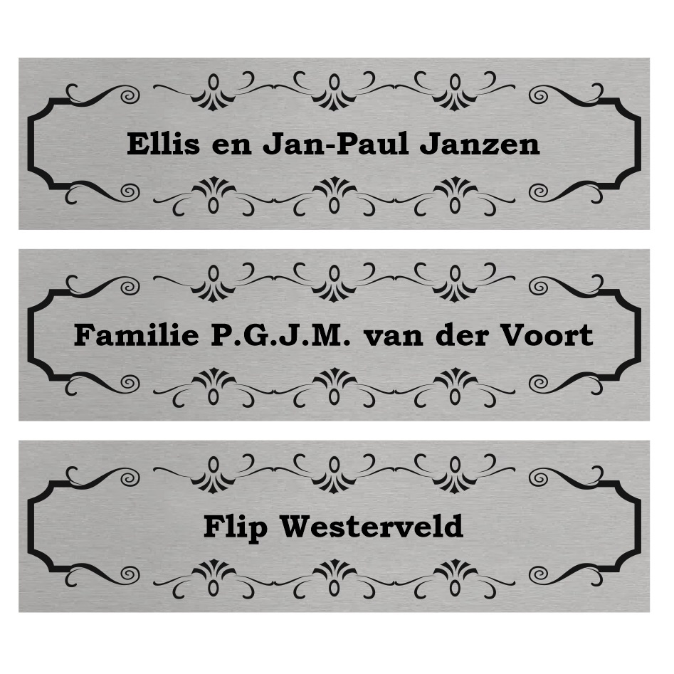 Deurbordjes, naamplaatjes voor op huisdeuren van zilverkleurig aluminium met tape aan de achterzijde. Deze huisdeur naambordjes zijn 165x45mm en ½ mm dik. Deurbordjes zijn zowel binnen als buiten te gebruiken. Het naamplaatje is een vintage uitvoering.