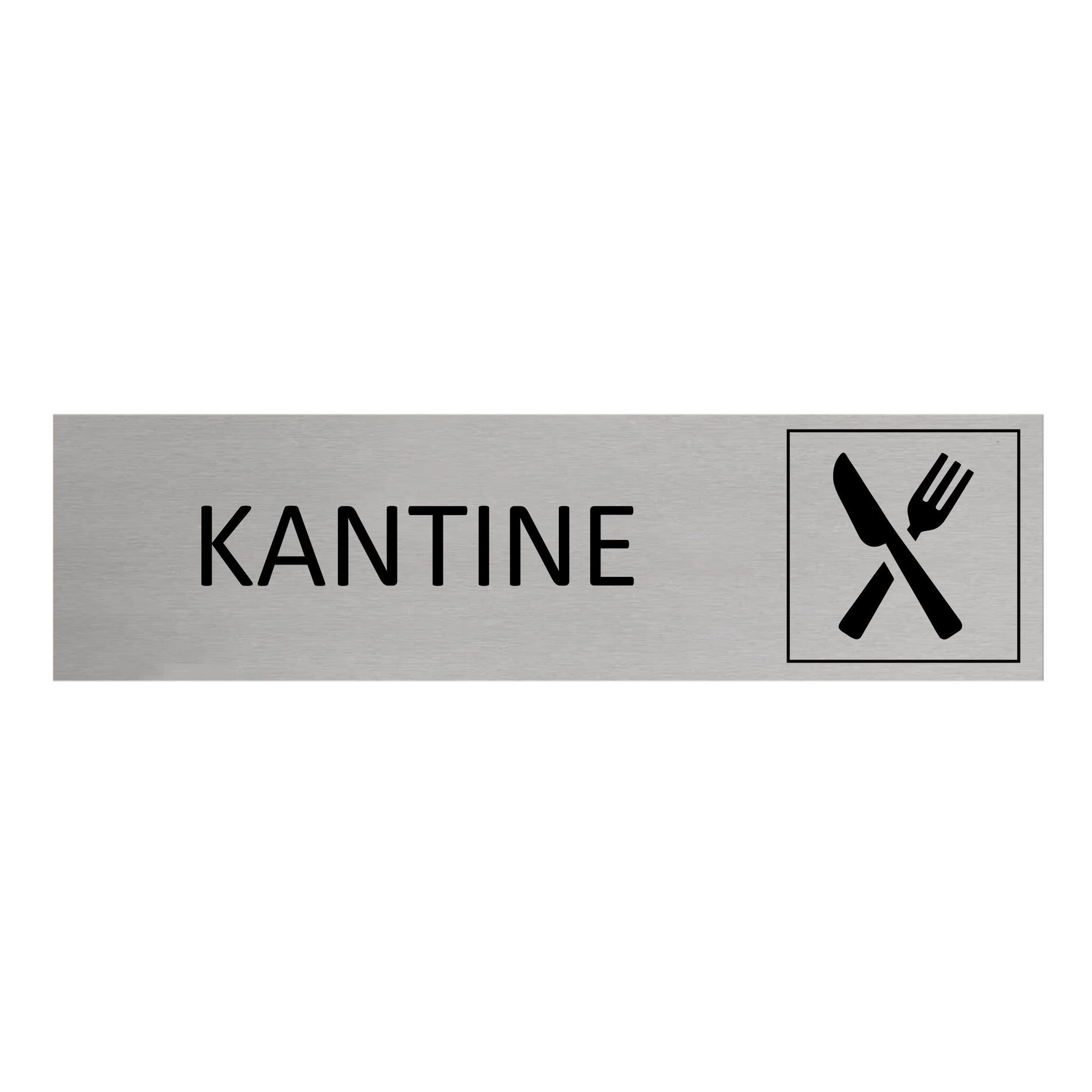 Deurbordje met de tekst Kantine, gemaakt van zilverkleurig aluminium. Het bordje heeft afmetingen van 165 x 45 mm. Voorzien van dubbelzijdige tape voor makkelijke bevestiging. Geschikt voor binnen en buiten. Per 1 stuk.