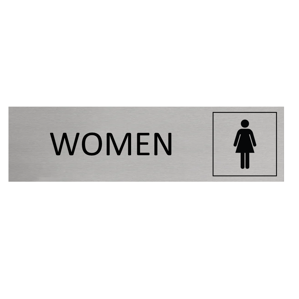 Deurbordje met een vrouwen icoon, gemaakt van zilverkleurig aluminium, Het bordje heeft afmetingen van 165 x 45 mm. Voorzien van dubbelzijdige tape voor makkelijke bevestiging. Geschikt voor binnen en buiten. Per 1 stuk.