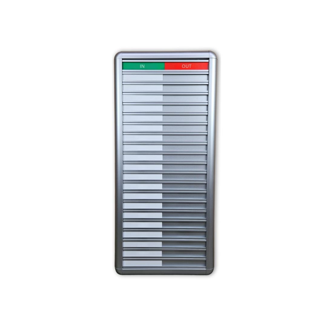 Een bord van 25,7 x 58 cm in RVS-look aluminium voorzien van 20 kunststof stroken voor namen van personeelsleden. De naamstroken zijn in het afwezigheidsbord te verschuiven van aanwezig naar afwezig. Standaard wordt Groen voor in en Rood voor out gebruikt.