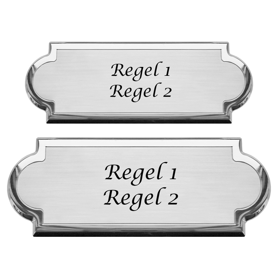 De aluminium Argentína naambordjes zijn verkrijgbaar in de maten 125 x 45 mm en 145 x 55 mm en hebben een dikte van 2 mm. Ze zijn gemaakt van zilverkleurig aluminium en stralen luxe uit. Daarnaast hebben ze een duidelijke en sierlijke rand. Voorzie de naambordjes van één of twee regels eigen tekst. De tekst wordt in zwart aangebracht middels lasergravering. Vul in de daarvoor bestemde velden de gewenste tekst in en kies het lettertype waarin je de tekst gegraveerd wilt hebben.