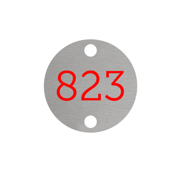 Nummerplaatjes van elox aluminium in het zilverkleur. Deze ronde nummertags zijn ½ mm dik en zijn verkrijgbaar in 30mm en 50mm. De nummerplaatjes hebben 2 gaatjes, boven en onder het nummer.