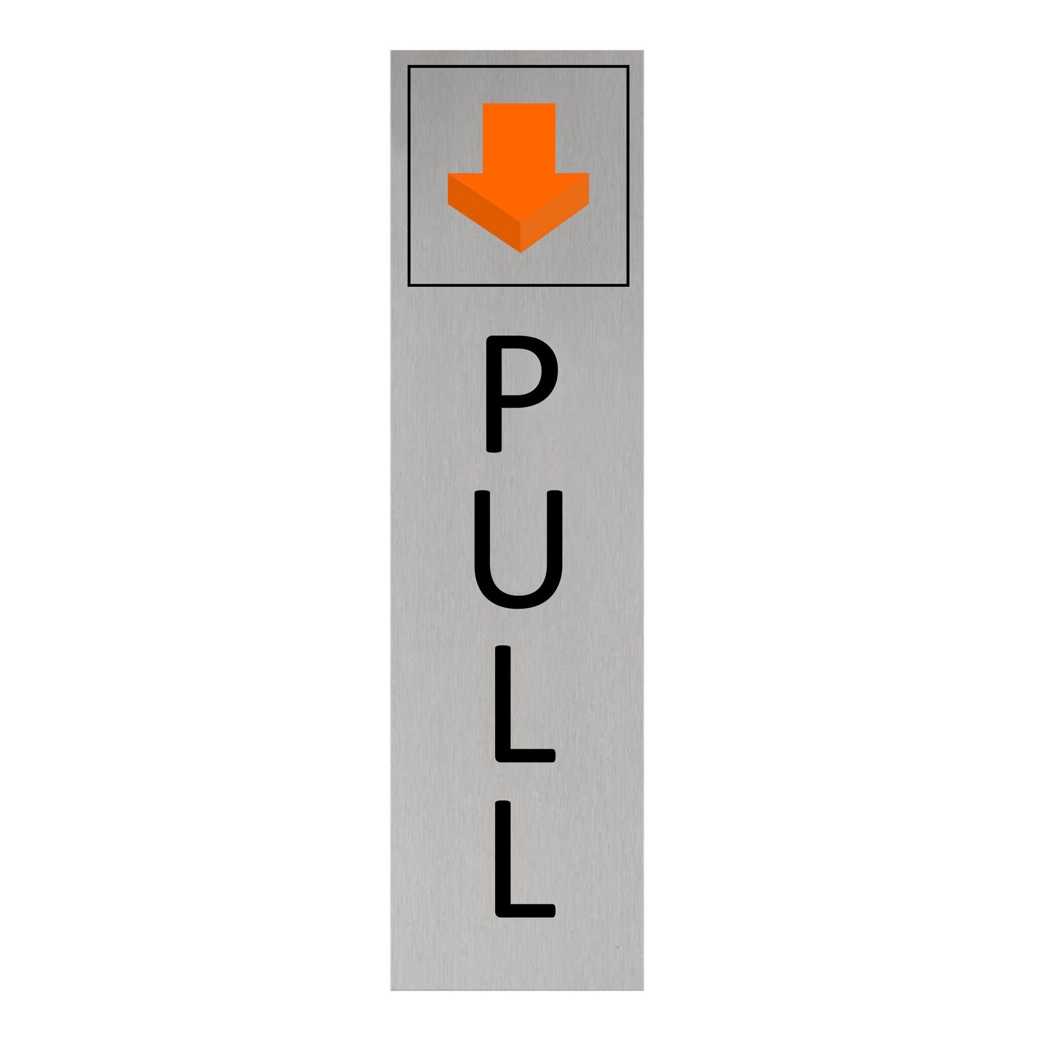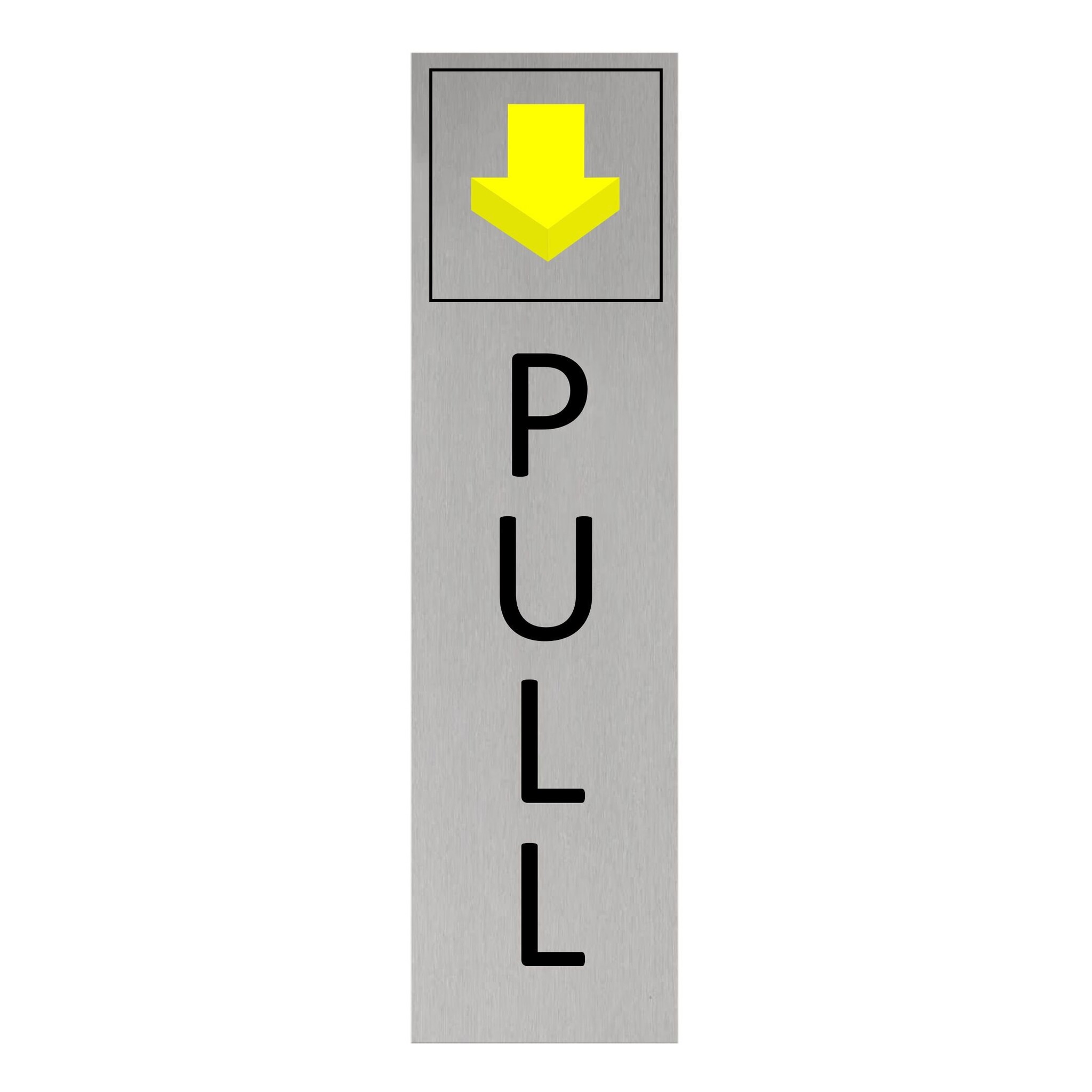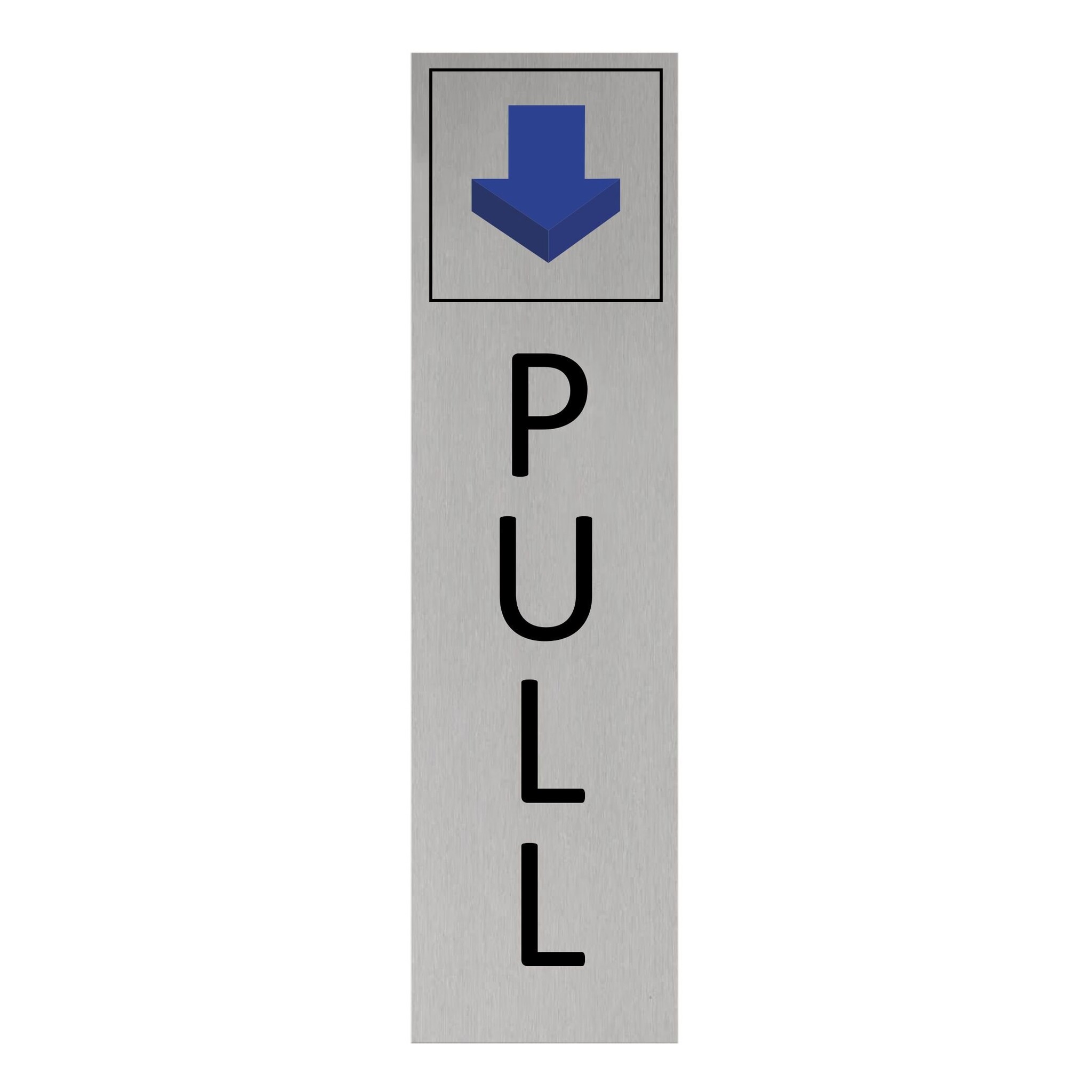 Een staand deurbordje met de tekst pull. Je kunt kiezen uit verschillende kleuren pijlen. Het bordje is gemaakt van zilverkleurig aluminium. Het bordje heeft afmetingen van 165 x 45 mm en is 0,5 mm dik. Voorzien van dubbelzijdige tape, voor makkelijke bevestiging op deuren of aan muren. Geschikt voor binnen en buiten. Verkrijgbaar per 1 stuk.