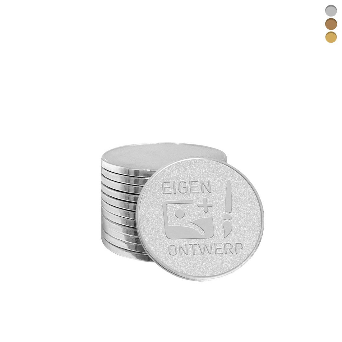 Deze brons gegoten automaatmunten zijn geschikt voor mechanische muntproevers. Deze muntproevers controleren het formaat van de munt. Je herkent dit type doordat je na het inwerpen nog een handmatige handeling moet uitvoeren om de munt door te drukken. De munten hebben een diameter van 20 mm en een dikte van 2 mm. Ze zijn afgewerkt met een mooie vernikkeling en een heldere glanzende polish, zodat ze niet roesten. Voor de afwerking kun je kiezen uit drie kleuren: brons, goud of zilver. De munten zijn verkrijgbaar per 100 stuks.