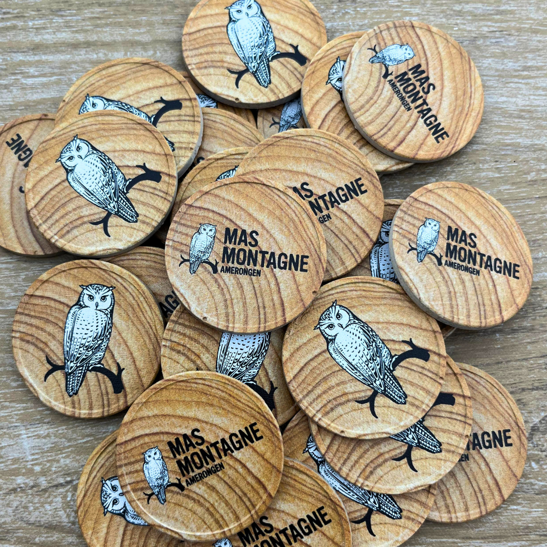 Mooi product. houten munten met twee verschillende logo's erop gedrukt Logo's zijn op de juiste wijze aangebracht. Binnen 5 werkdagen in huis.