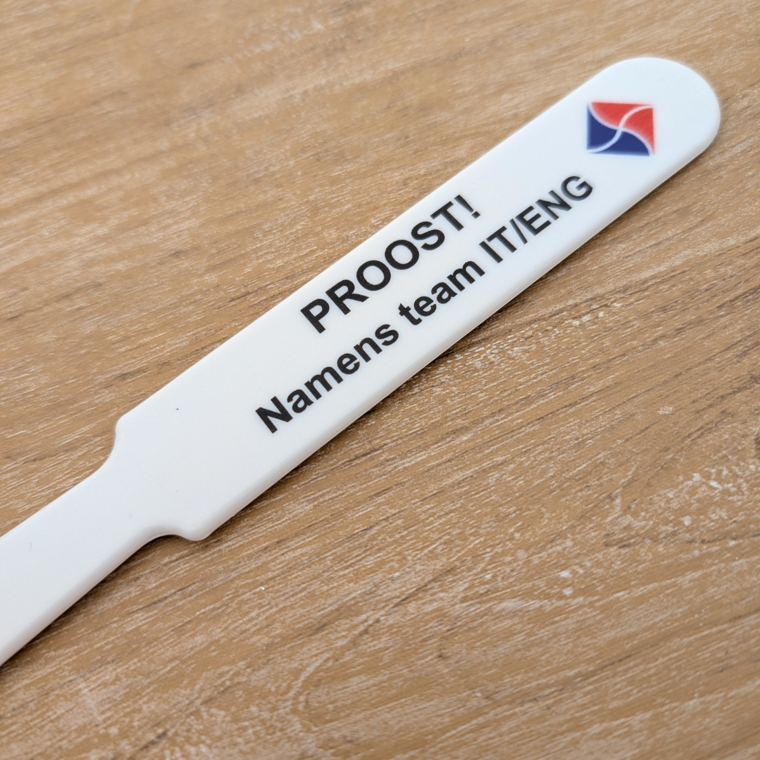 De bierafschuimer kun je zelf online personaliseren door te klikken op de groene knop “personaliseren” boven in de pagina. Vervolgens kun je ervoor kiezen om een tekst, eigen logo of één van onze standaard afbeeldingen op de bierspatel te plaatsen. Deze teksten kun je ook volledig personaliseren. Op deze manier maak jij de bierafschuimer volledig op maat. Maak vooraf de een keuze of je de bierafschuimer enkelzijdig bedrukt wil hebben, dubbelzijdig gelijk bedrukt wil hebben of dubbelzijdig ongelijk bedrukt wil hebben.