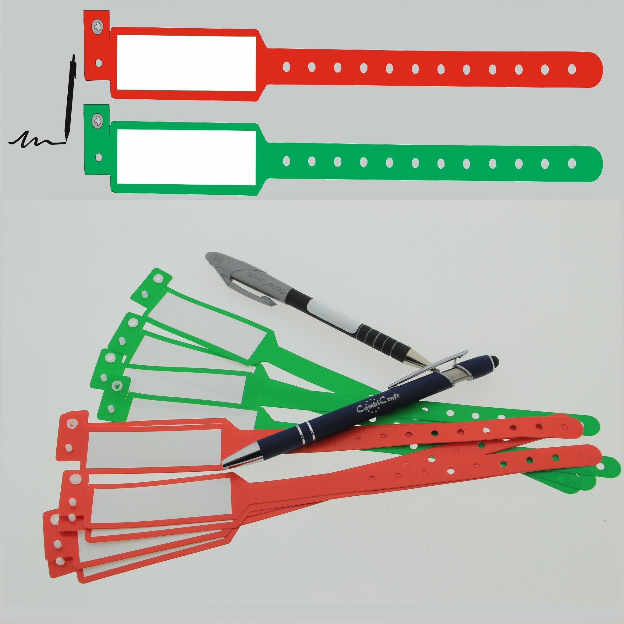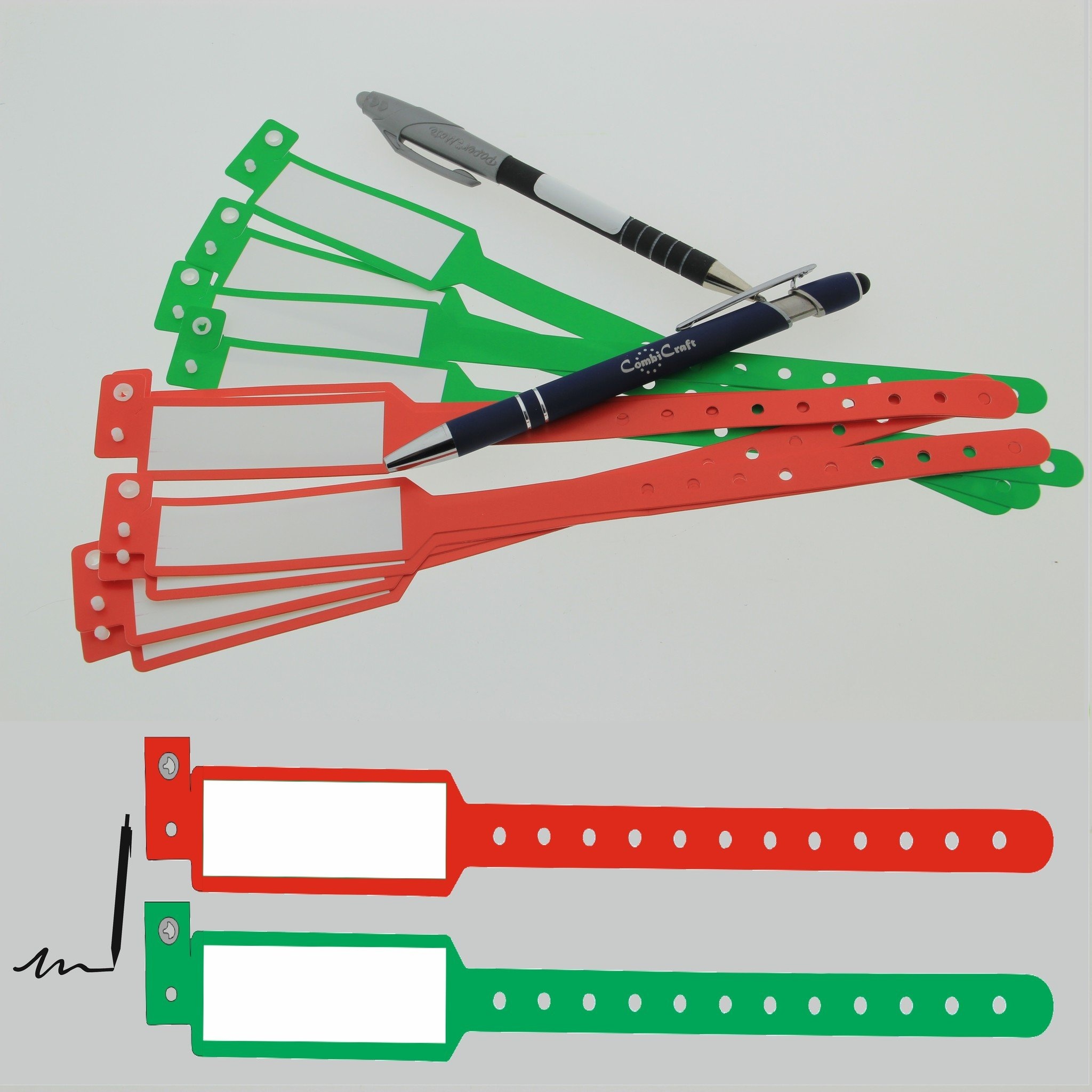 Beschrijf je eigen groene of rode polsbandjes voor feestjes, evenementen of activiteiten zoals een schoolreisje. Ideaal om bijvoorbeeld een naam, telefoonnummer of andere contactgegevens op te schrijven.