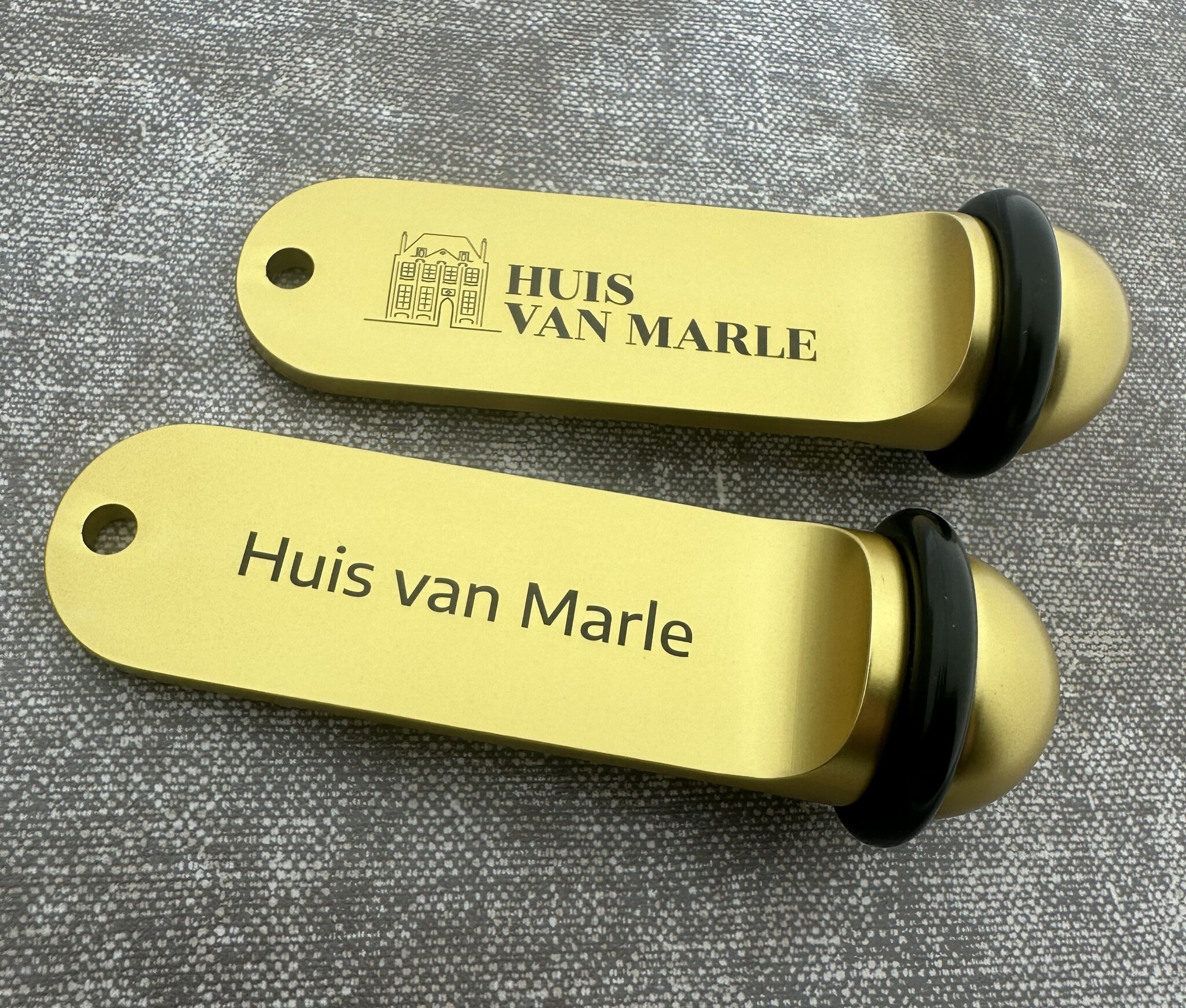 De gouden Big Classic wordt voorzien van zwarte gravering naar wens. Hierdoor kun je een persoonlijke tint toevoegen. Zo wordt een logo, nummer of tekst mooi in het zwart gegraveerd op de sleutelhanger. Kies het aantal regels en lettertype voor het complete plaatje. De zwarte gravering in combinatie met het goud geeft jouw personalisatie een mooi en duidelijk contrast.
