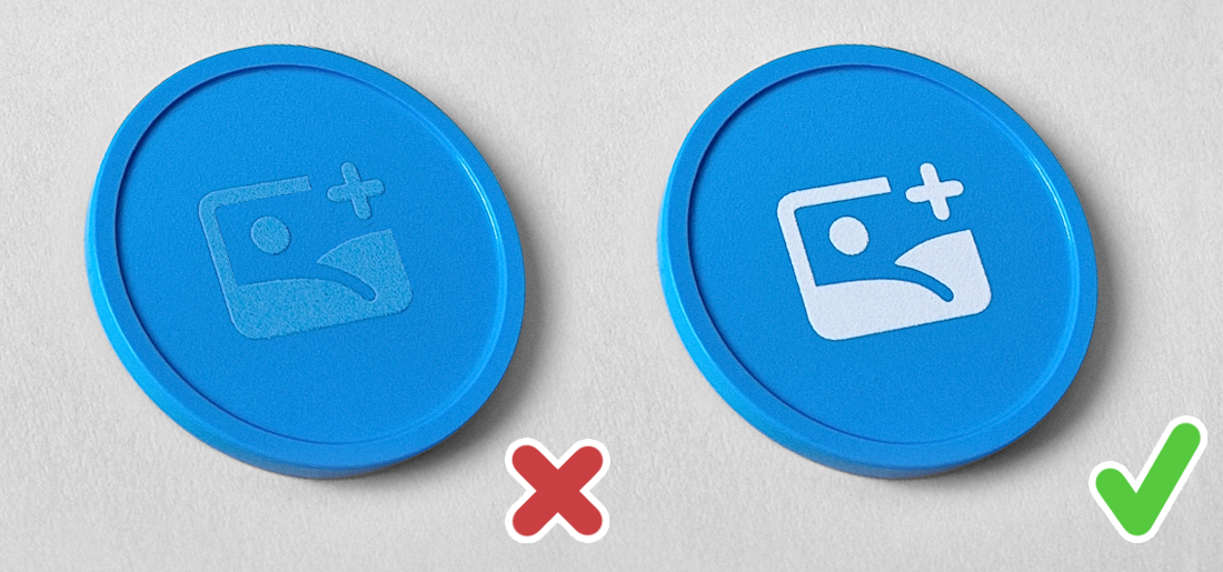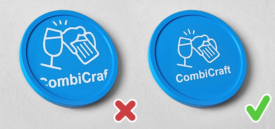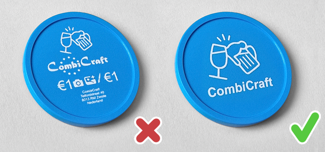 Kies je een ontwerp dat qua kleur te dicht bij de muntkleur ligt, zoals rood op rood, roze op rood of donkere kleuren op zwart, dan wordt het moeilijk leesbaar. Zorg altijd voor voldoende contrast tussen de munt en het ontwerp. Zo blijft de munt duidelijk voor zowel de gebruiker als voor de persoon die de munten aanneemt, bijvoorbeeld bij de bar
