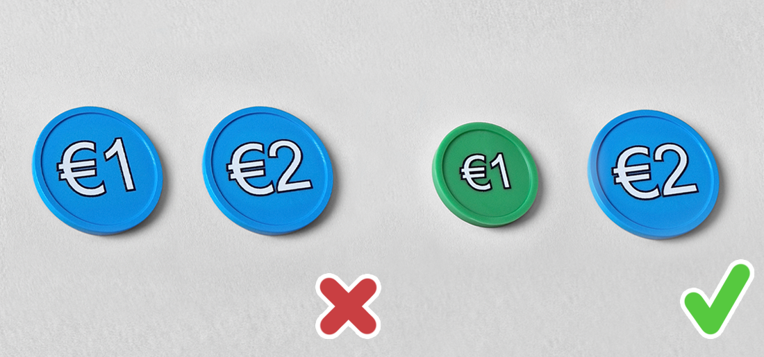 Bij het ontwerpen van munten is het belangrijk dat er onderscheid is tussen de verschillende toepassingen. Als verschillende toepassingen op dezelfde muntkleur worden weergegeven, zoals een biericoon en een wijnicoon op een rode munt, wordt het verschil lastig zichtbaar voor bijvoorbeeld het barpersoneel. Kies daarom verschillende muntkleuren voor verschillende toepassingen en overweeg ook variatie in muntgroottes. Zo is het onderscheid altijd duidelijk, vooral tijdens drukke momenten.