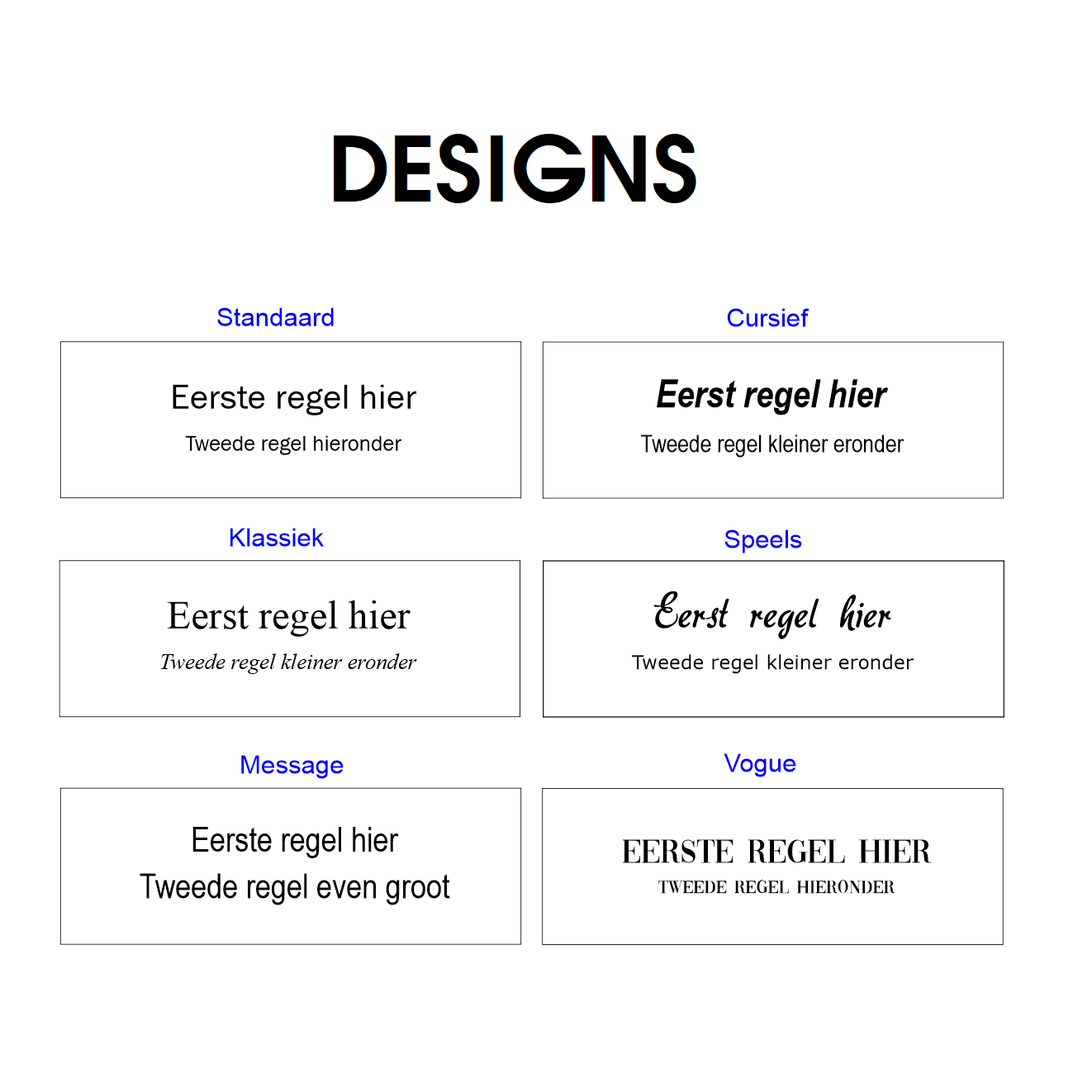 De opdruk is standaard in het zwart voor een goede leesbaarheid. Het is mogelijk om zelf een stijl te kiezen voor de opdruk, deze kun je bekijken bij de afbeeldingen en selecteren bij 'kies je design'. Mocht je een full colour opdruk willen dan kun je kiezen voor het bureau naambordje Kelby eigen ontwerp. Wees aan het begin wat voorzichtig met de opdruk, deze is na 14 dagen tot 3 weken pas volledig uitgehard.