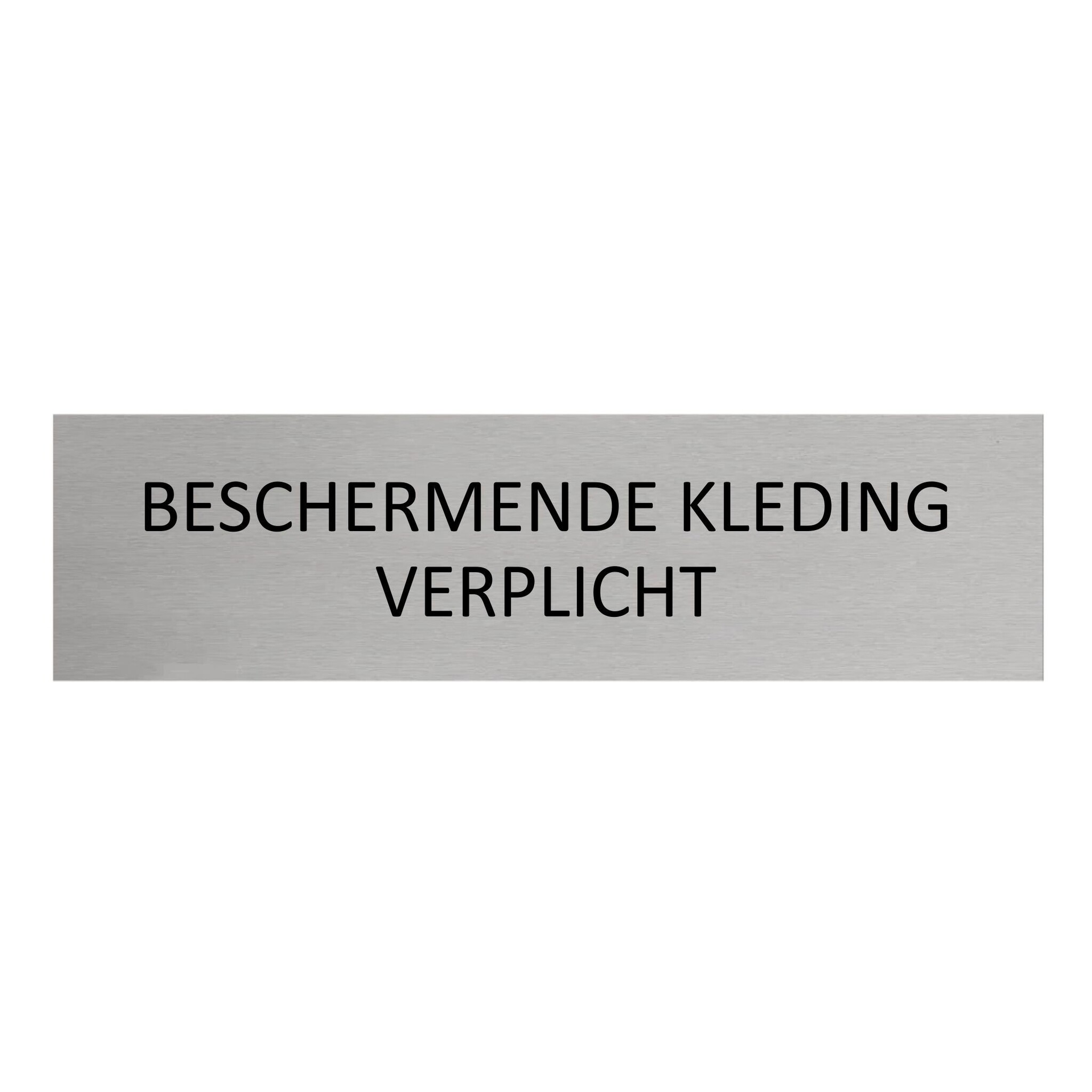 Deurbordje met de tekst 'Beschermende kleding verplicht', gemaakt van zilverkleurig aluminium. Het bordje heeft afmetingen van 165 x 45 mm en een dikte van 0,5 mm. Aan de achterzijde zit 3M-tape, voor makkelijke bevestiging. Geschikt voor binnen en buiten. Per 1 stuk.