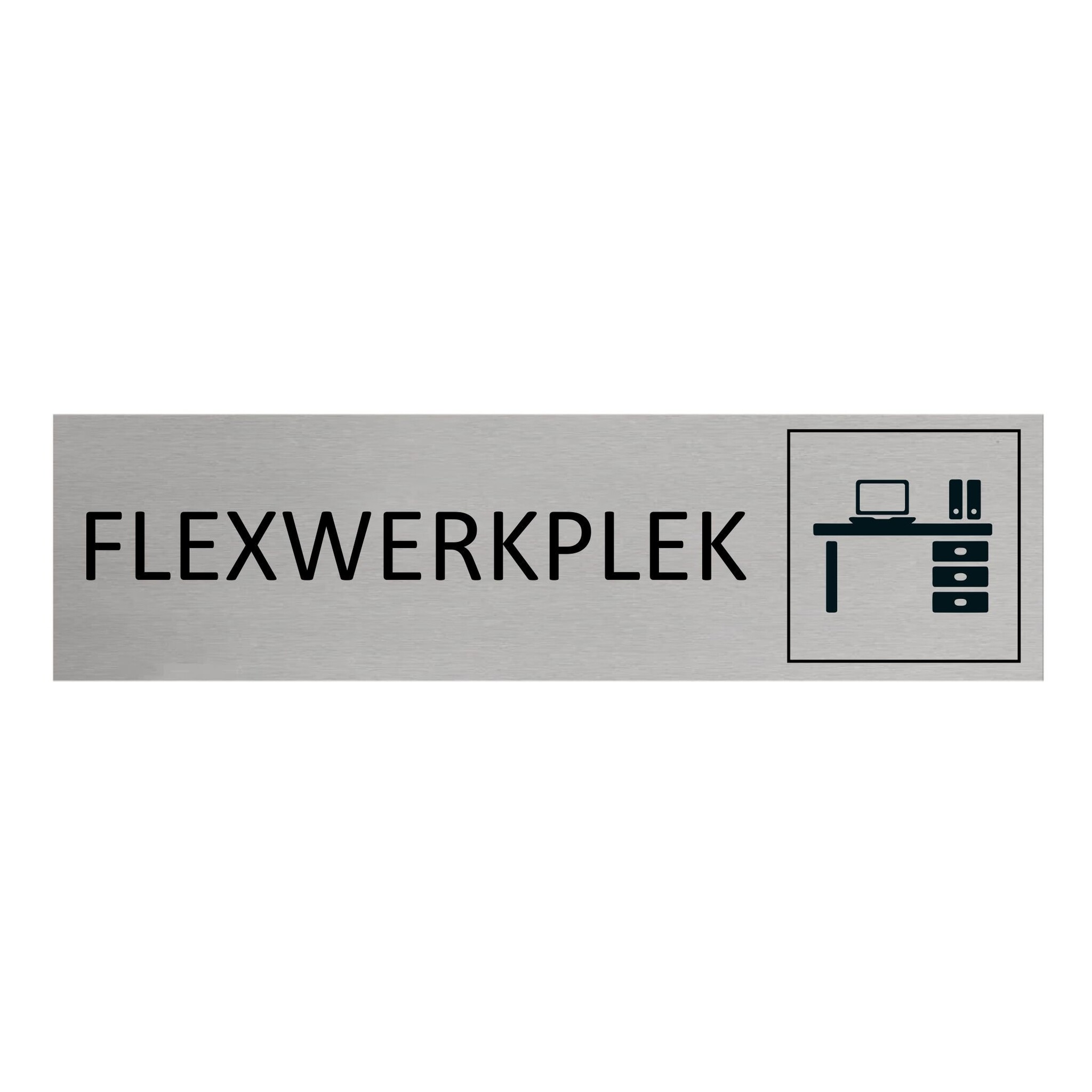 Deurbordje met de tekst 'Flexwerkplek', gemaakt van zilverkleurig aluminium. Het bordje heeft afmetingen van 165 x 45 mm en een dikte van 0,5 mm. Aan de achterzijde zit 3M-tape, voor makkelijke bevestiging. Geschikt voor binnen en buiten. Per 1 stuk.