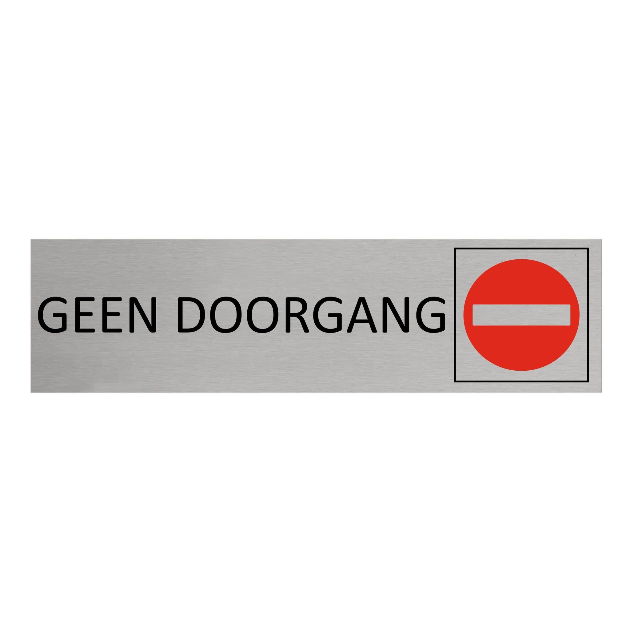Deurbordje met de tekst 'Geen doorgang', gemaakt van zilverkleurig aluminium. Het bordje heeft afmetingen van 165 x 45 mm en een dikte van 0,5 mm. Aan de achterzijde zit 3M-tape, voor makkelijke bevestiging. Geschikt voor binnen en buiten. Per 1 stuk.