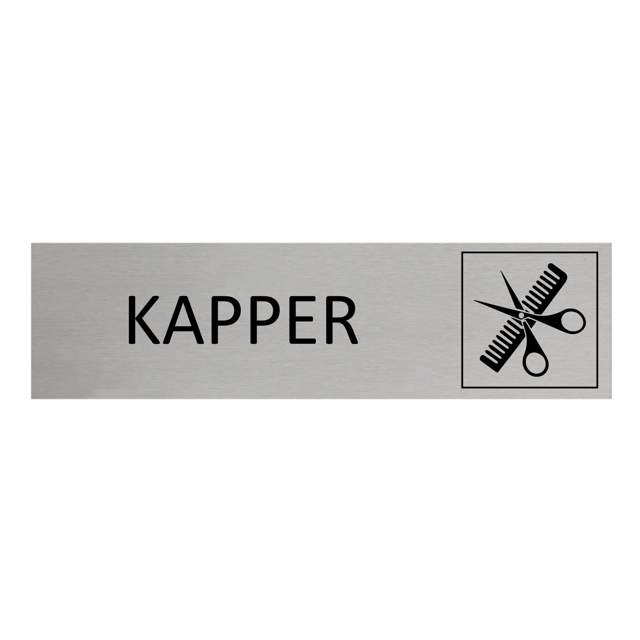 Deurbordje met de tekst 'Kapper', gemaakt van zilverkleurig aluminium. Het bordje heeft afmetingen van 165 x 45 mm en een dikte van 0,5 mm. Aan de achterzijde zit 3M-tape, voor makkelijke bevestiging. Geschikt voor binnen en buiten. Per 1 stuk.