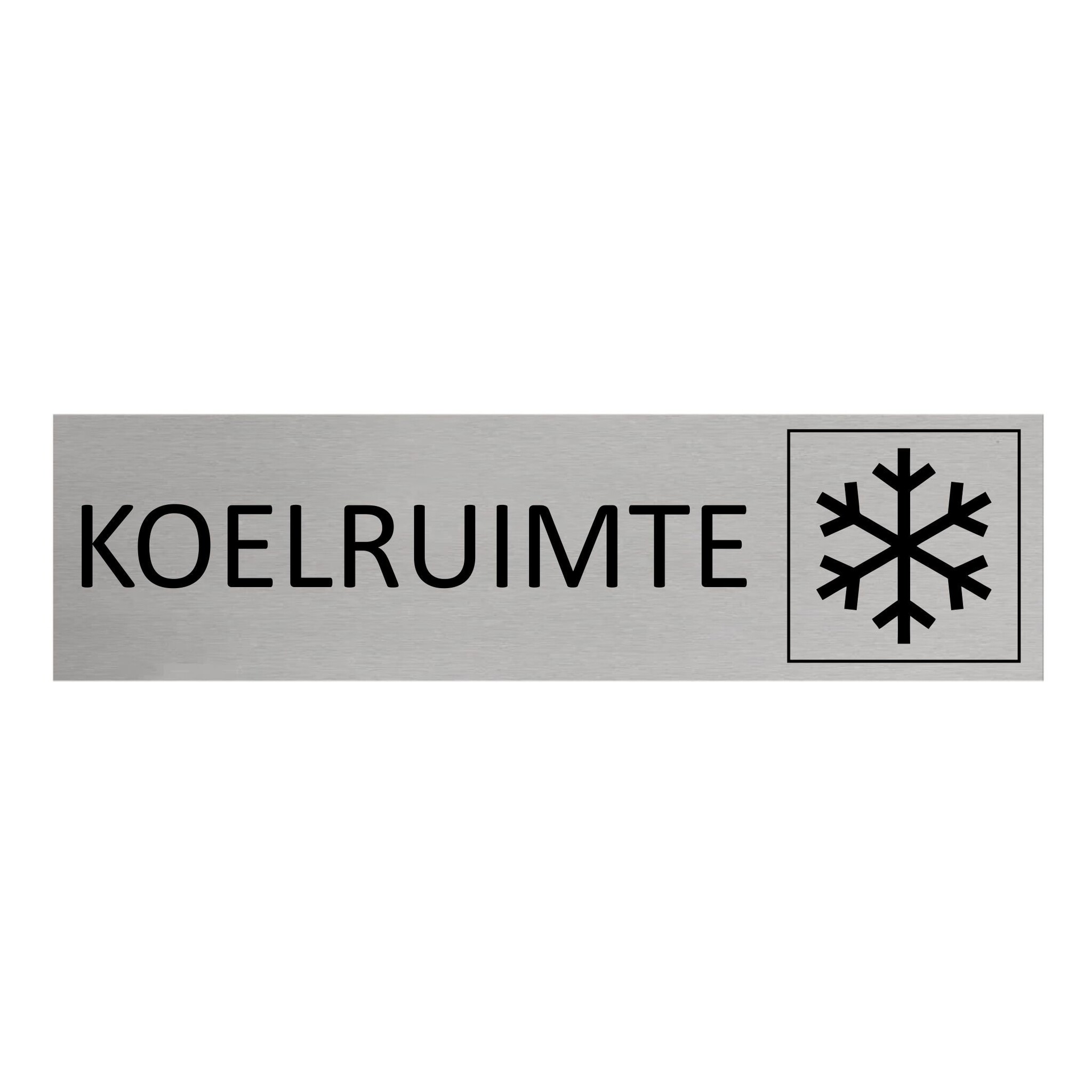 Deurbordje met de tekst 'Koelruimte', gemaakt van zilverkleurig aluminium. Het bordje heeft afmetingen van 165 x 45 mm en een dikte van 0,5 mm. Aan de achterzijde zit 3M-tape, voor makkelijke bevestiging. Geschikt voor binnen en buiten. Per 1 stuk.