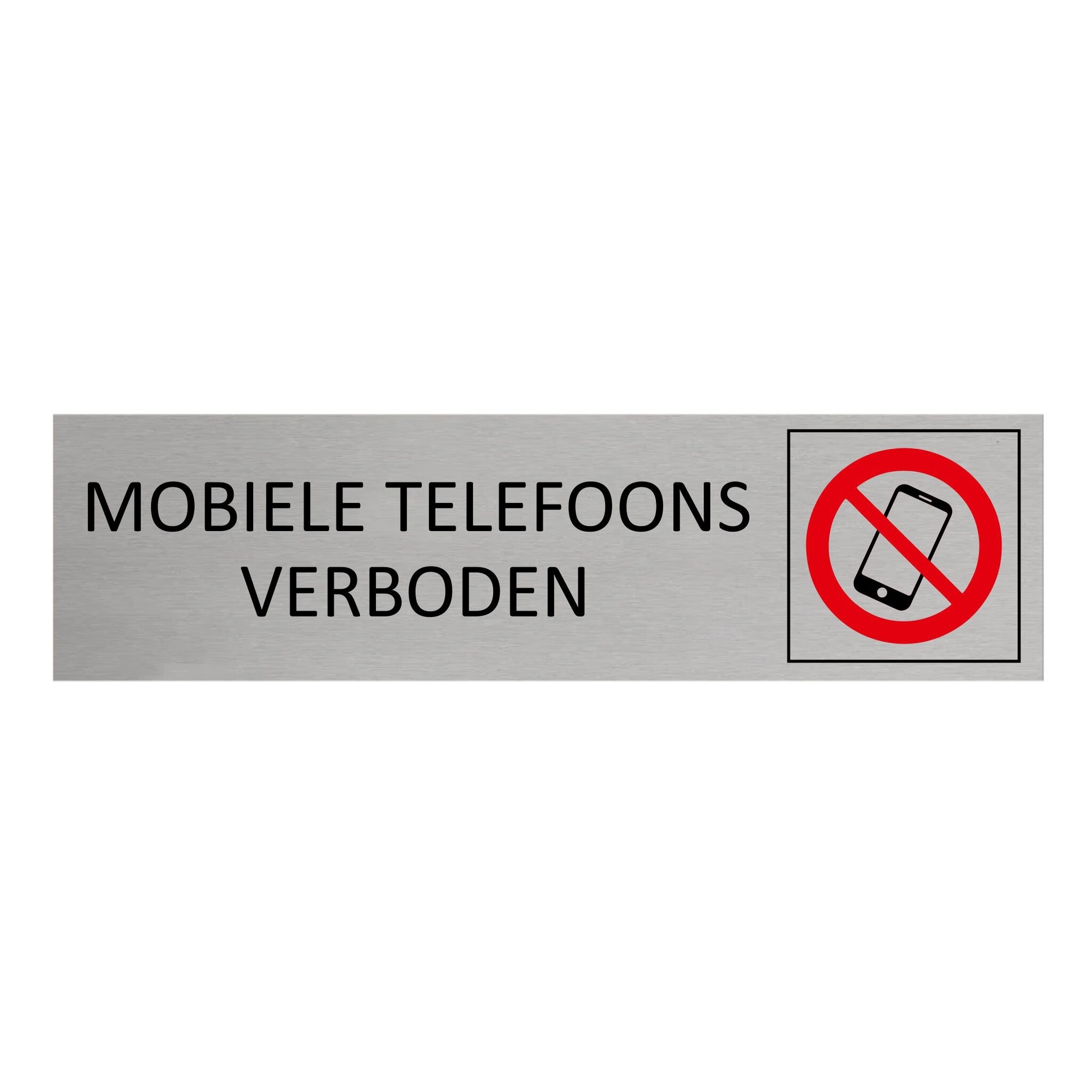 Deurbordje met de tekst 'Mobiele telefoons verboden', gemaakt van zilverkleurig aluminium. Het bordje heeft afmetingen van 165 x 45 mm en een dikte van 0,5 mm. Aan de achterzijde zit 3M-tape, voor makkelijke bevestiging. Geschikt voor binnen en buiten. Per 1 stuk.