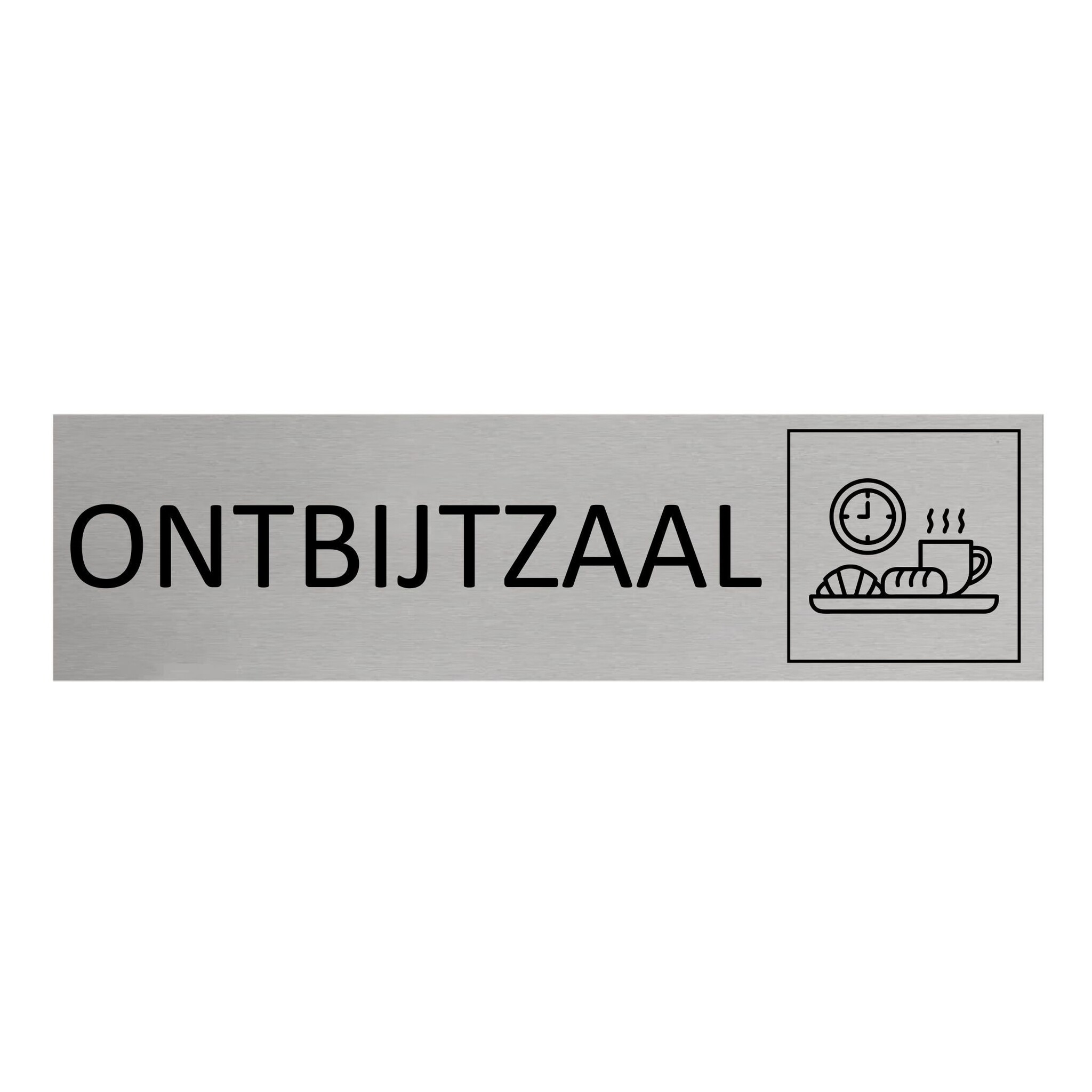 Deurbordje met de tekst 'Ontbijtzaal', gemaakt van zilverkleurig aluminium. Het bordje heeft afmetingen van 165 x 45 mm en een dikte van 0,5 mm. Aan de achterzijde zit 3M-tape, voor makkelijke bevestiging. Geschikt voor binnen en buiten. Per 1 stuk.