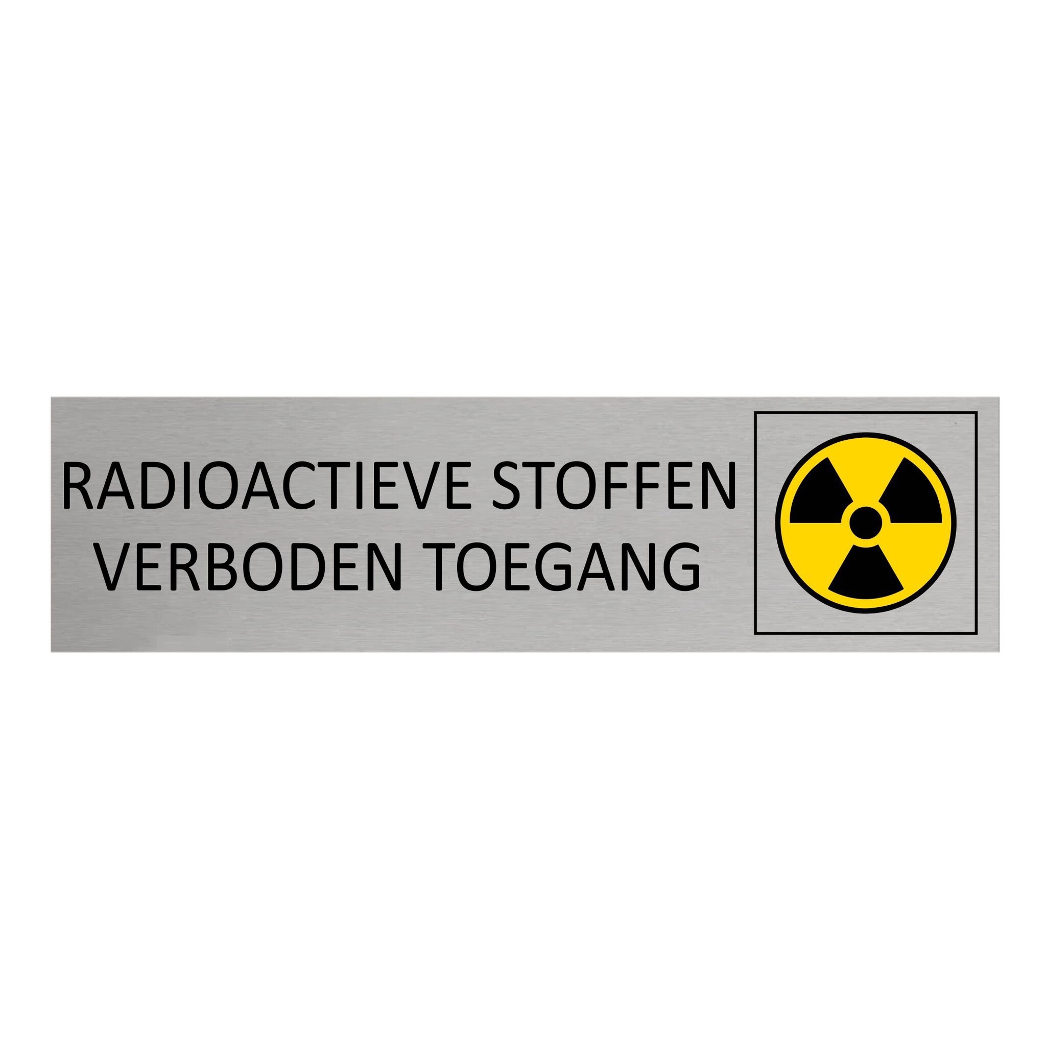 Deurbordje met de tekst 'Radioactieve stoffen — verboden toegang', gemaakt van zilverkleurig aluminium. Het bordje heeft afmetingen van 165 x 45 mm en een dikte van 0,5 mm. Aan de achterzijde zit 3M-tape, voor makkelijke bevestiging. Geschikt voor binnen en buiten. Per 1 stuk.