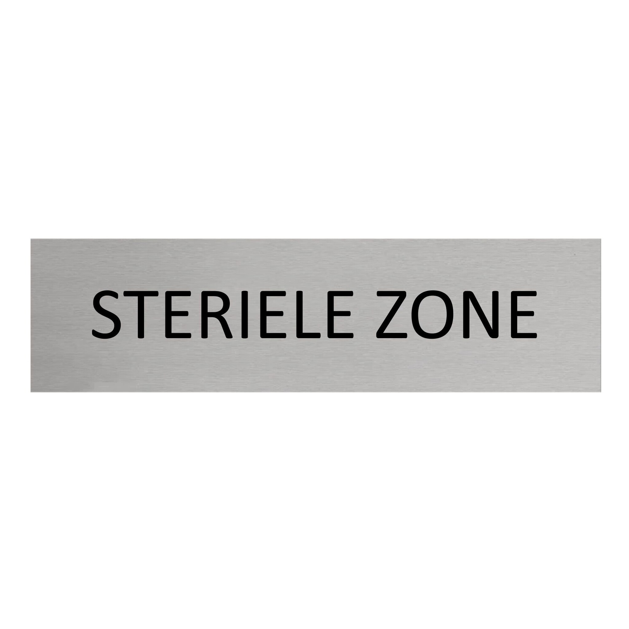 Deurbordje met de tekst 'Steriele zone', gemaakt van zilverkleurig aluminium. Het bordje heeft afmetingen van 165 x 45 mm en een dikte van 0,5 mm. Aan de achterzijde zit 3M-tape, voor makkelijke bevestiging. Geschikt voor binnen en buiten. Per 1 stuk.