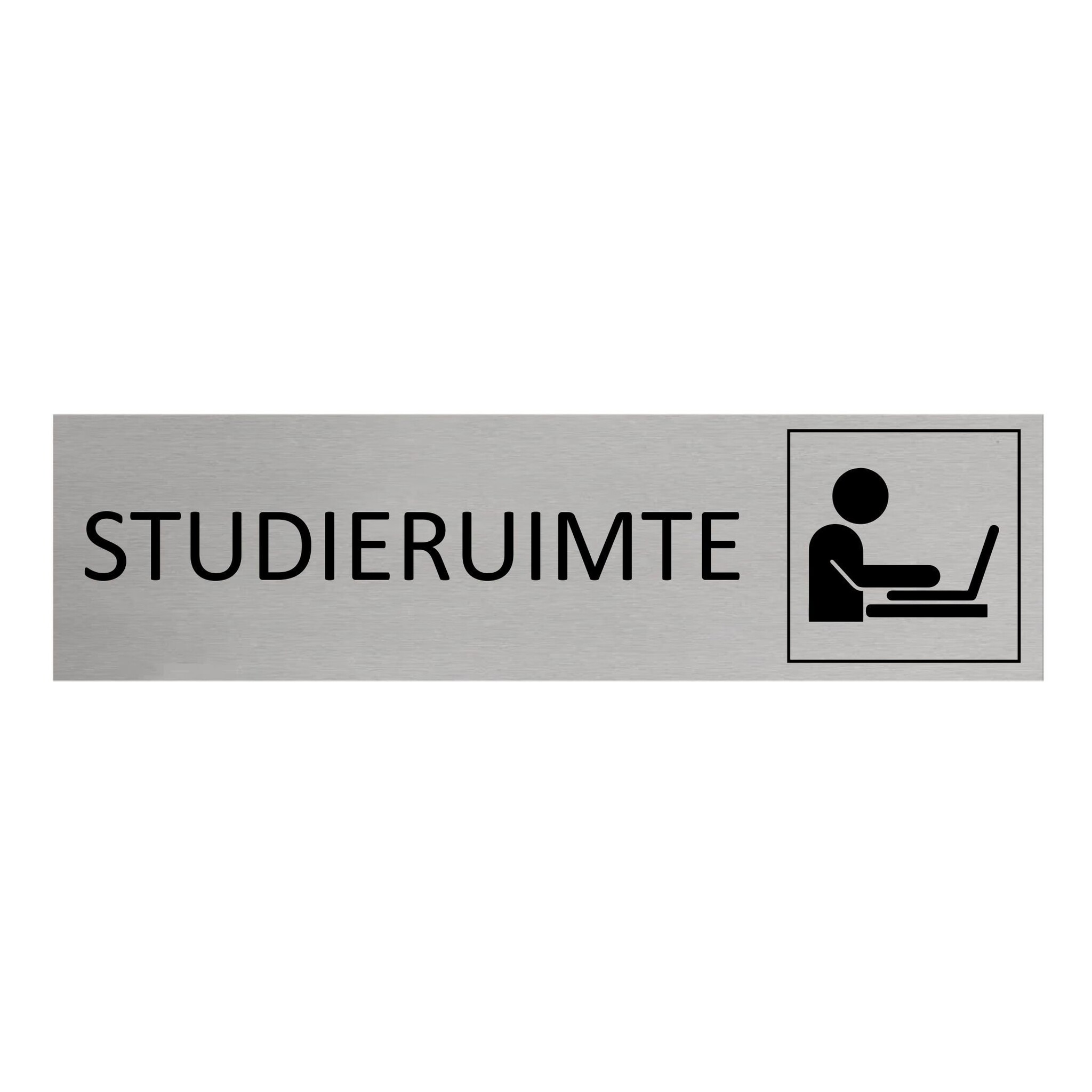 Deurbordje met de tekst 'Studieruimte', gemaakt van zilverkleurig aluminium. Het bordje heeft afmetingen van 165 x 45 mm en een dikte van 0,5 mm. Aan de achterzijde zit 3M-tape, voor makkelijke bevestiging. Geschikt voor binnen en buiten. Per 1 stuk.