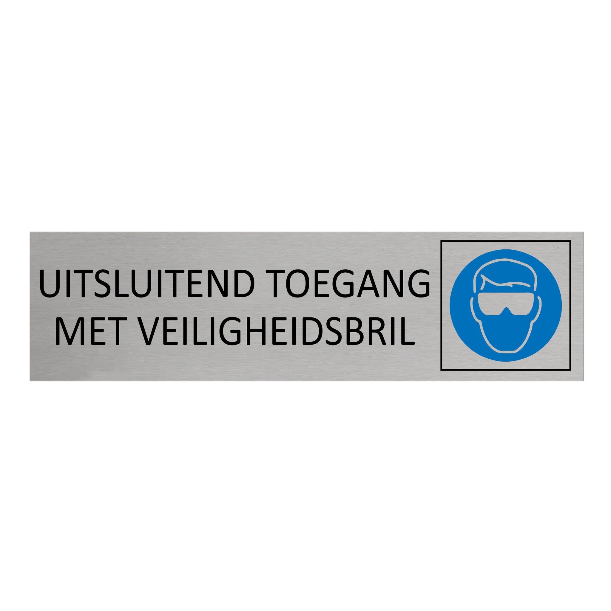 Deurbordje met de tekst 'Uitsluitend toegang met veiligheidsbril', gemaakt van zilverkleurig aluminium. Het bordje heeft afmetingen van 165 x 45 mm en een dikte van 0,5 mm. Aan de achterzijde zit 3M-tape, voor makkelijke bevestiging. Geschikt voor binnen en buiten. Per 1 stuk.