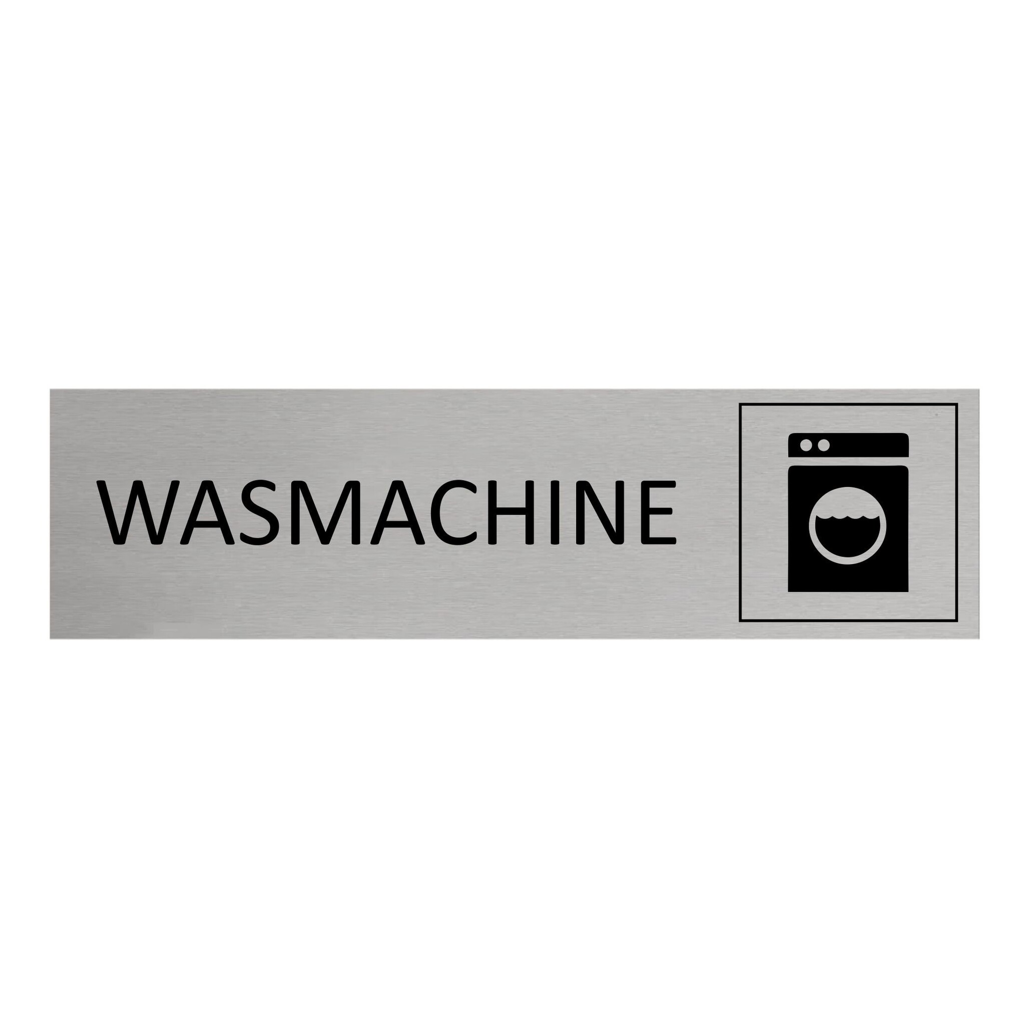 Deurbordje met de tekst 'Wasmachine', gemaakt van zilverkleurig aluminium. Het bordje heeft afmetingen van 165 x 45 mm en een dikte van 0,5 mm. Aan de achterzijde zit 3M-tape, voor makkelijke bevestiging. Geschikt voor binnen en buiten. Per 1 stuk.